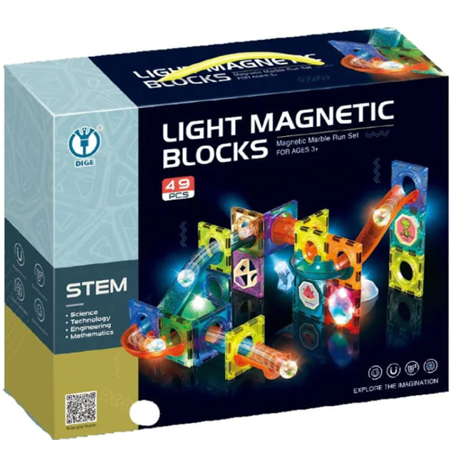 Набор включает в себя 49 элементов с магнитом, посредством которых, используя инструкцию или собственное воображение можно конструировать разнообразные фигуры. Собранный конструктор светится в темноте за счет светящихся элементов, некоторые из них имеют несколько вариантов подсветки.