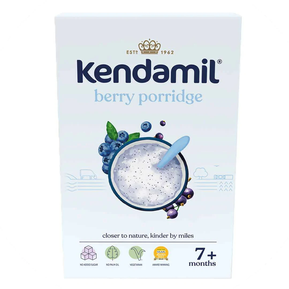Молочная каша Kendamil со вкусом черники и черной смородины изготовлена с витаминизированным цельным коровьим молоком, без искусственных ингредиентов и сахара, для детей с 7 месяцев и вегетарианского питания.