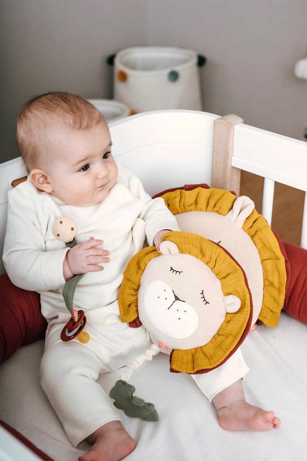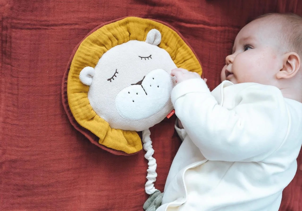Вышитые детали: Глаза, носик и щеки льва вышитые нитями, что делает игрушку полностью безопасной для использования с первых дней жизни.