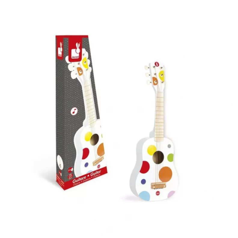 Шестиструнная гитара от бренда Janod удивит и обрадует любого ребенка. Она выполнена из дерева и имеет интересный и позитивный дизайн, который точно будет вдохновлять на создание музыкальных композиций.