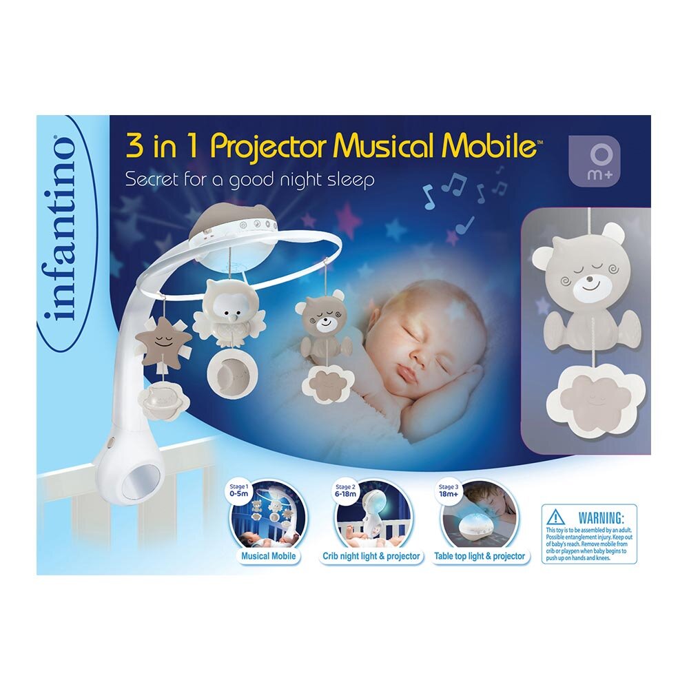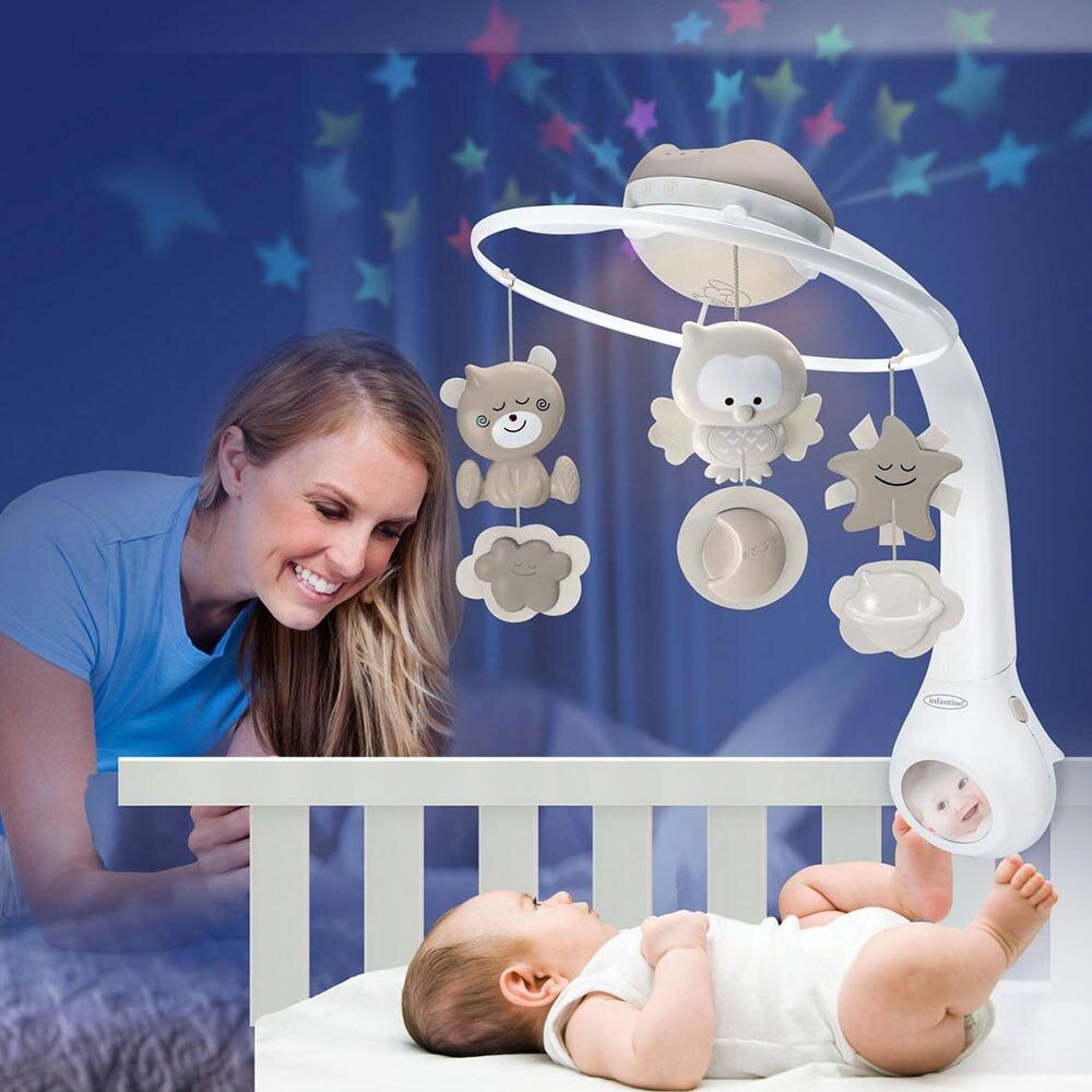 Мобиль музыкальный с проектором 3 в 1 INFANTINO – это мобиль, ночник на кроватку и настольный ночник. Для новорожденных деток нужно прикрутить к кроватке мобиль. Красивые мелодии и крутящиеся игрушки спокойного серого цвета будут привлекать внимание малыша и успокаивать его. Вы можете включить подстветку или проектор. Мобиль имеет 6 различных мелодий и 4 варианта звуков природы, которые успокаивают деток. Также можно повесить на кроватку отдельно ночник-проектор.