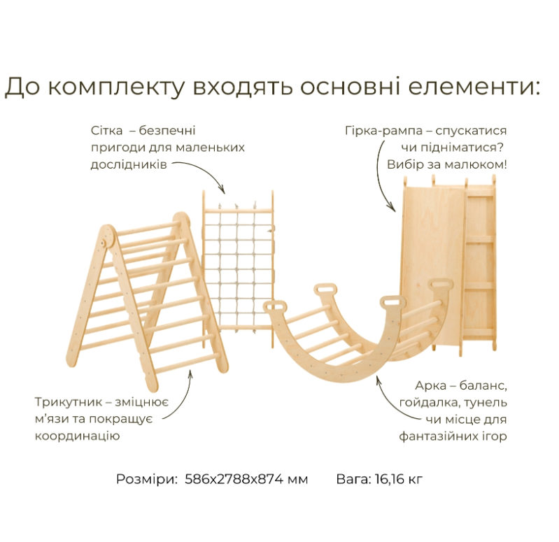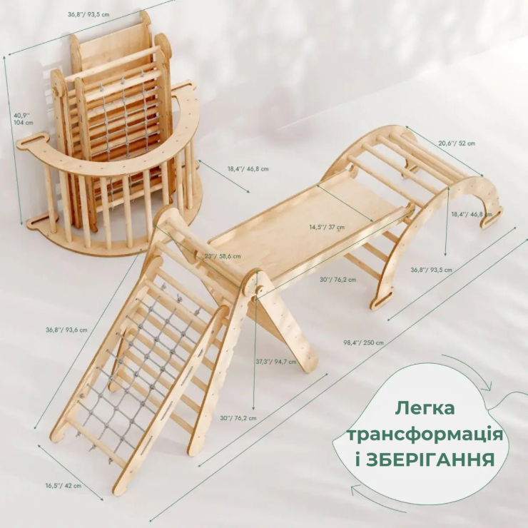 Треугольная лестница служит одновременно как тренировочным инструментом для начинающих, так и увлекательной игрушкой. Благодаря просторной полезной поверхности, она прекрасно подходит для энергичных детей и может легко вместить двух играющих одновременно детей.