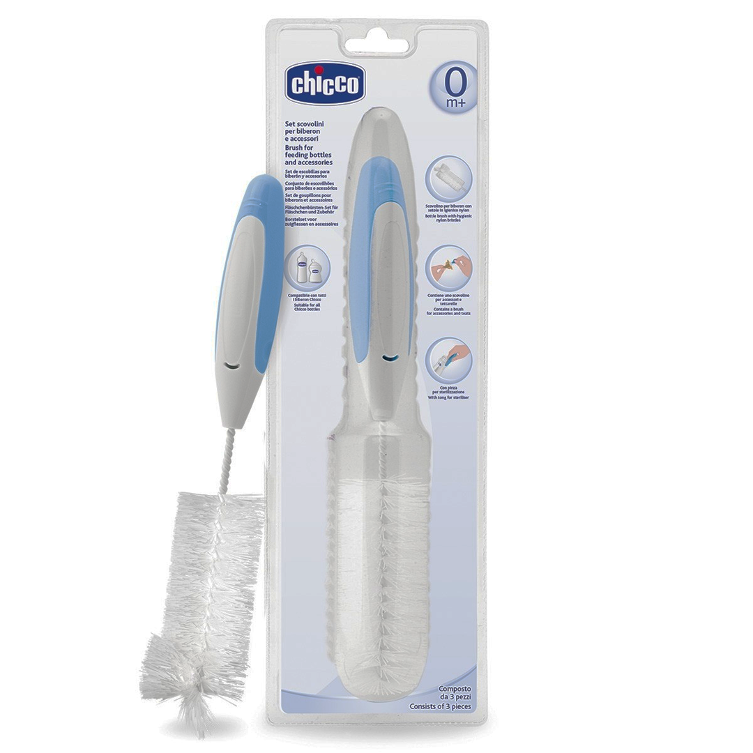Набор для мытья посуды от итальянского производителя Chicco. В комплект входит большой и маленький ершики. Изготовлены из гигиенических нейлоновых щетинок, которые приспосабливаются к любой форме и чистят разную поверхность, обеспечивая глубокое очищение. Большой ершик для мытья бутылочек разбирается. После снятия нижней части ручки он превращается в щипцы. Они предназначены для удобного и быстрого захвата бутылочек после стерилизации. Для чистки сосок в комплекте есть маленький ершик.
