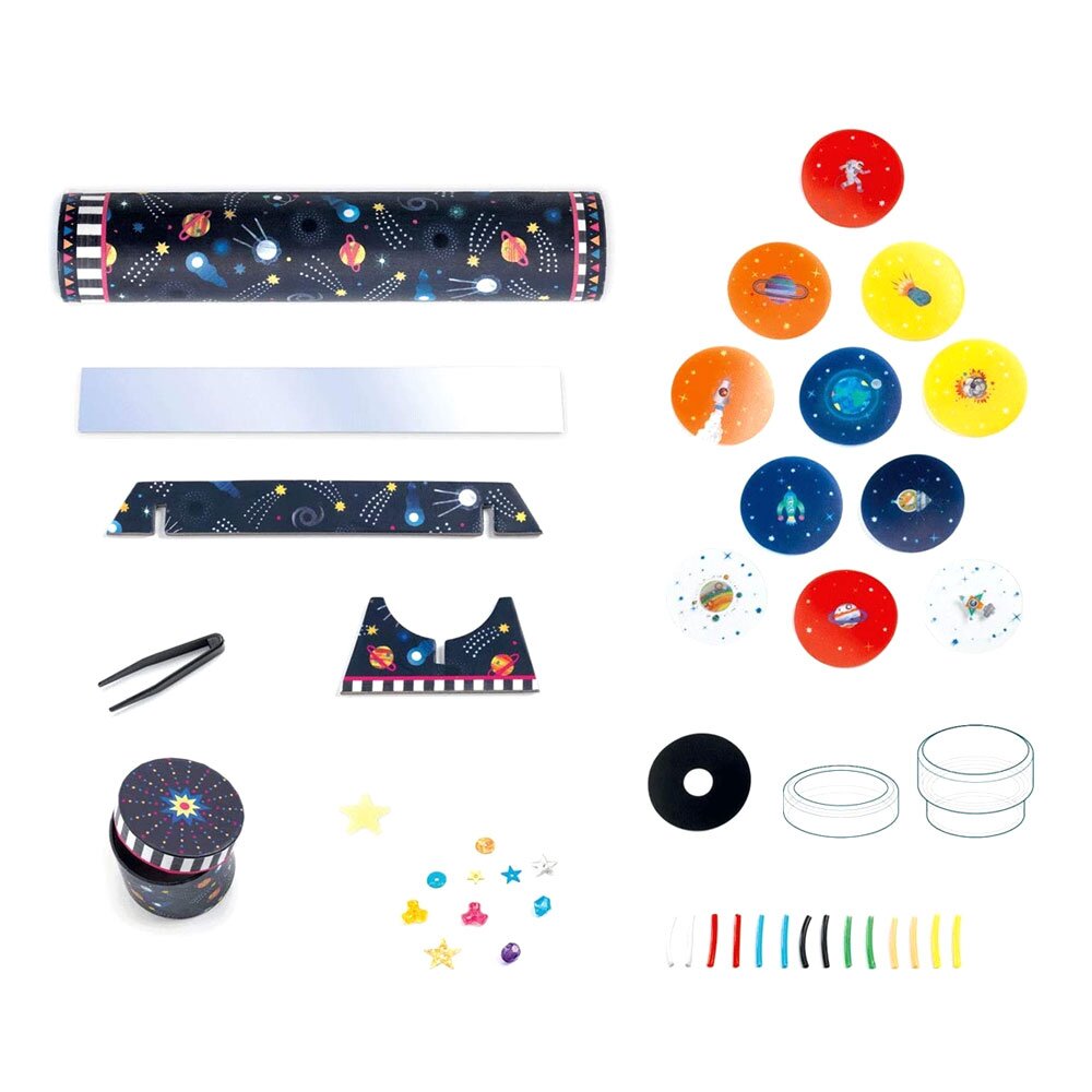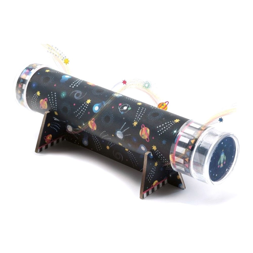 Набор DJECO Сделай сам Космический калейдоскоп завораживает детей! Он подарит положительные эмоции и разовьет интерес! Ведь каждый раз можно создавать новые детали и оптические узоры! Для этого в наборе есть специальные иллюстрации разных цветов и бусины. Свой собственный калейдоскоп — это же просто мечта. Он безопасен, изготовлен из качественных материалов.