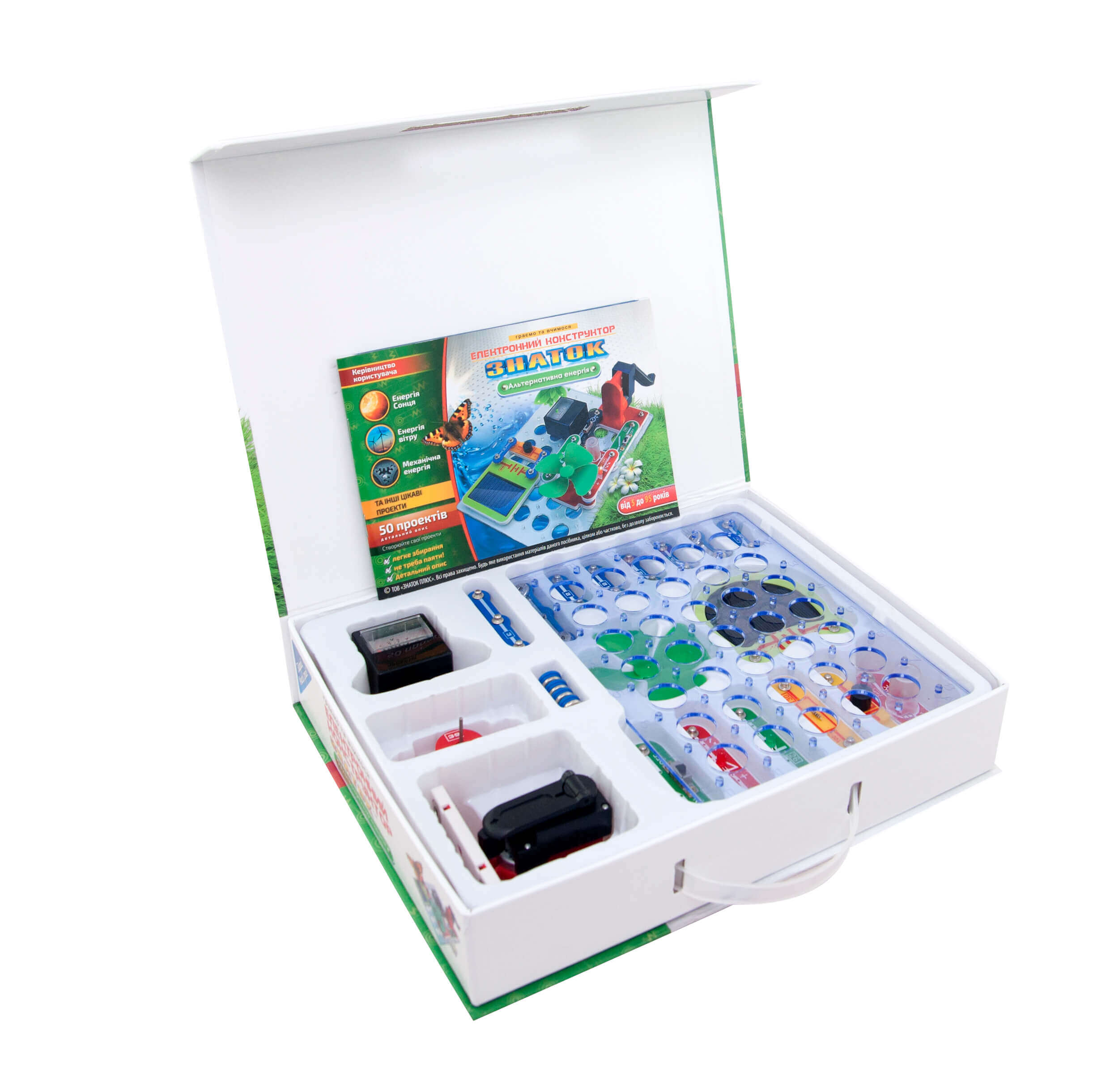 Конструктор ZNATOK «Альтернативная энергия» предназначен для творческих детей, С его помощью ребенок познакомится с альтернативными источниками энергии. В комплекте есть инструкция, с помощью которой ребенок сможет собрать 50 проектов для изучения энергии солнца, ветра и механической энергии. Работа конструктора абсолютно безопасна, так как паять ничего не нужно.