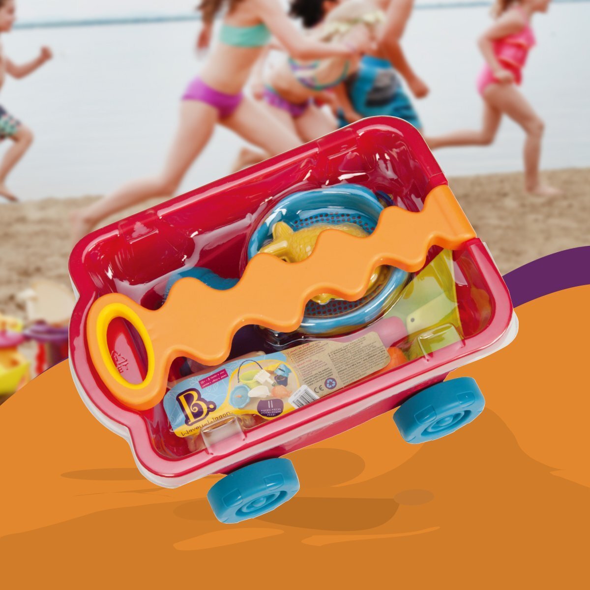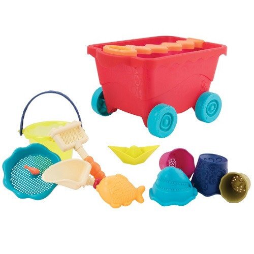 Симпатичная тележка с причудливой ручкой включает полезные аксессуары для игры в песочнице и на пляже: большое ведерце с ситом для песка, лопатку, грабли, кораблик, пасочку-рыбку, а также 3 маленьких ведерца с отверстиями, которые можно вкладывать друг в друга, ставить друг на друга в виде башни и закрывать крышкой в форме акулы.