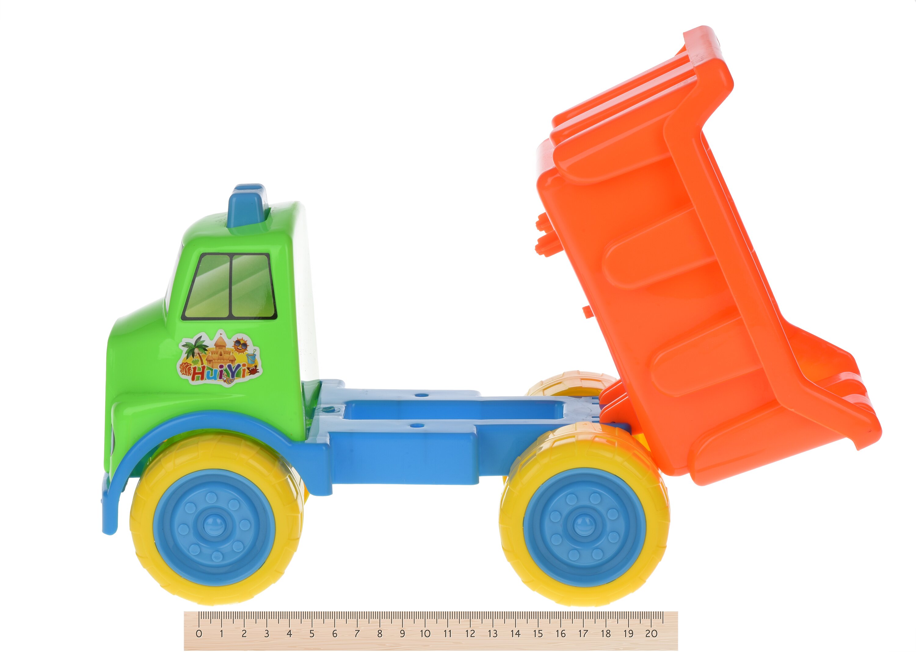 Набор для игр в песке. В наборе есть интересный грузовик-самосвал, он яркий, разноцветный, сразу же привлекает внимание и стимулирует образное мышление. Ребенок сможет играть машинкой даже дома, в детском саду и т.д. Кроме машинки (ее размер 27х15х19 см), в наборе есть другие аксессуары: инструменты и формочки. Все они яркие, изготовленные из безопасного, нетоксичного пластика.