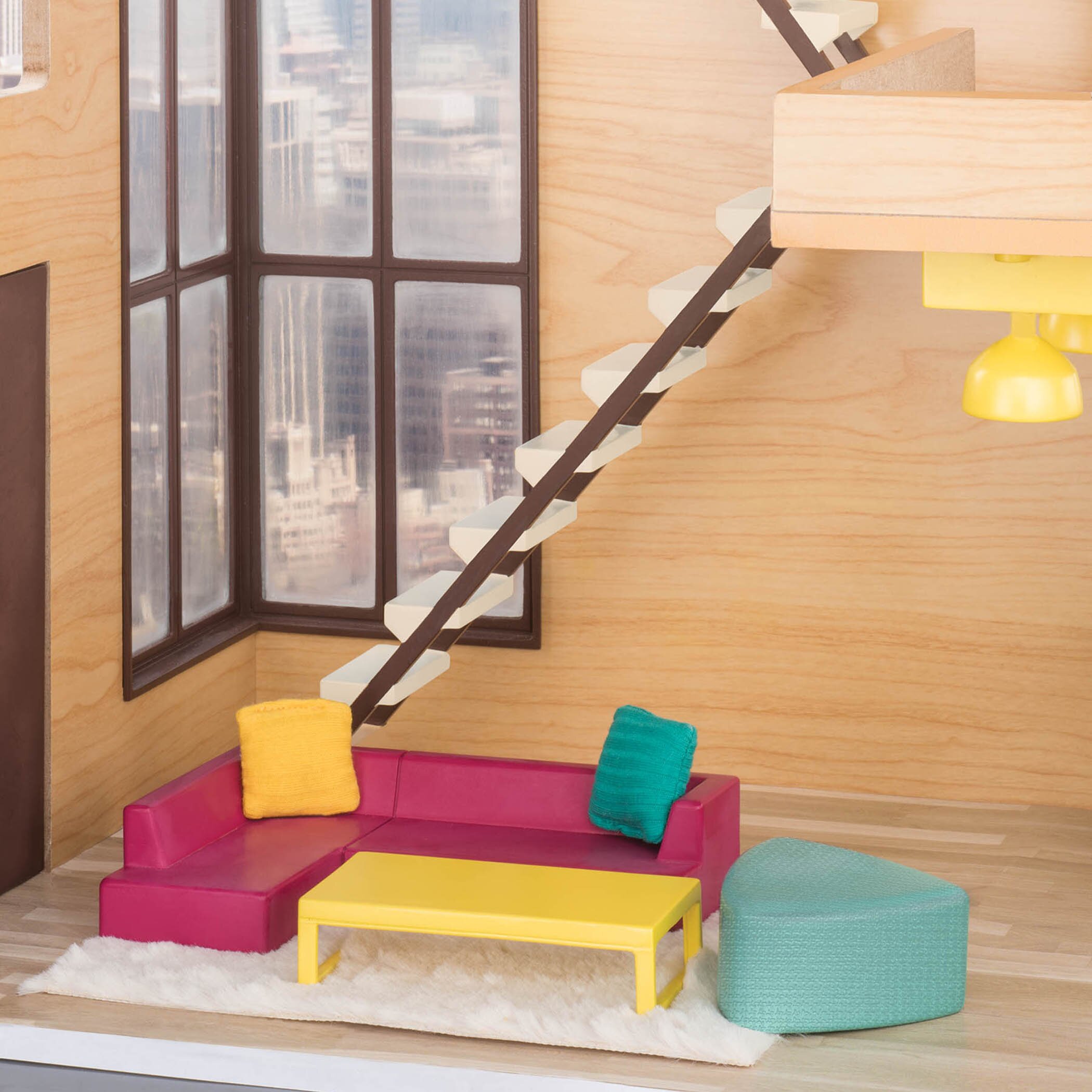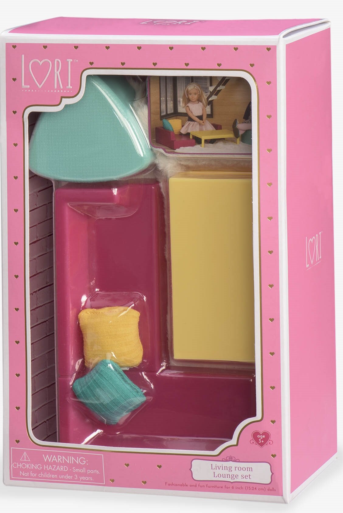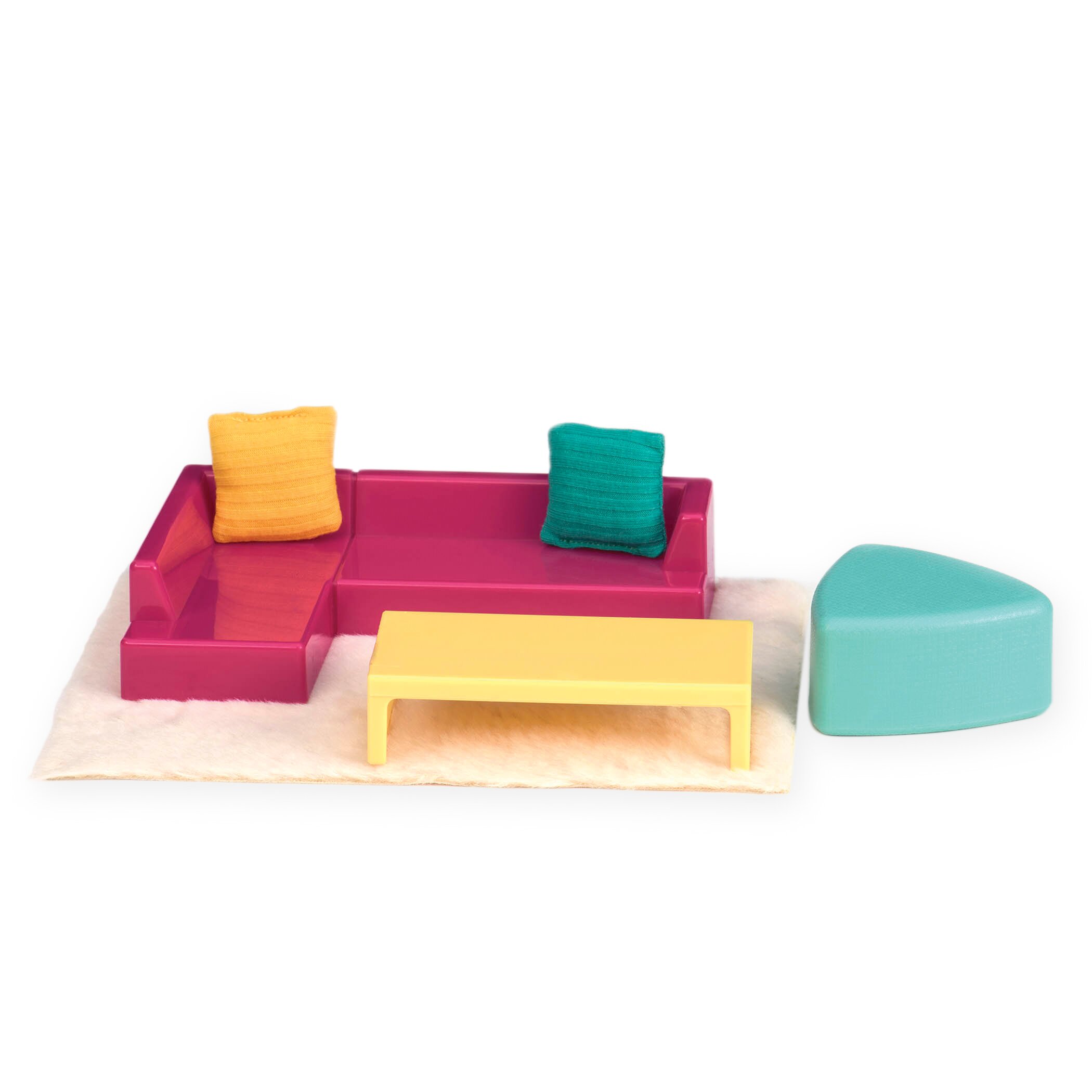 Яркая мебель, которая поможет создать интересный и оригинальный дизайн гостиной в кукольном домике. В набор входит: диван, пуф, 2 подушки, столик, ковер. Собирайте веселую компанию друзей и устраивайте шумные вечеринки в ярком интерьере современной гостиной. Все элементы набора изготовлены из текстиля и качественной пластмассы и являются абсолютно безопасными для детей. Комплект мебели совместим со всеми куклами LORI 15 см. Игра с набором будет поощрять творчество и сюжетно-ролевую игру у детей.