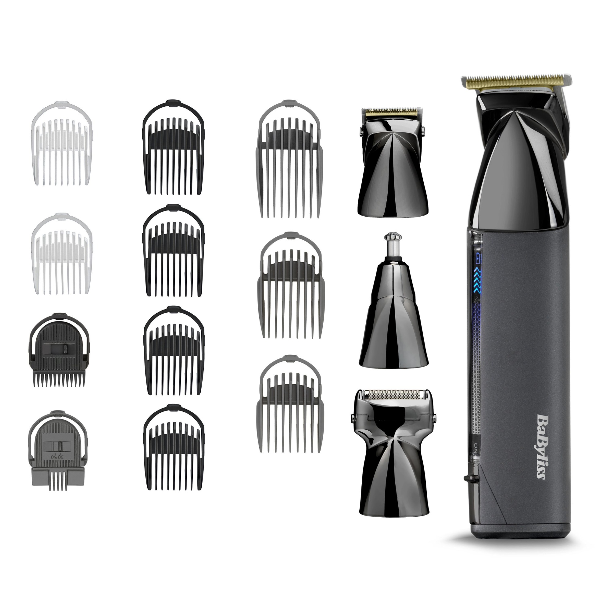Набор для стрижки BaByliss MT991E Super-X Metal Series 15-в-1 - универсальное решение для ухода за волосами, бородой и телом. Оснащен титановыми лезвиями, магнитными насадками и водостойким корпусом. В комплекте 15 аксессуаров для точного моделирования. Работает до 5 часов без подзарядки, поддерживает быструю зарядку. Идеален для домашнего использования.