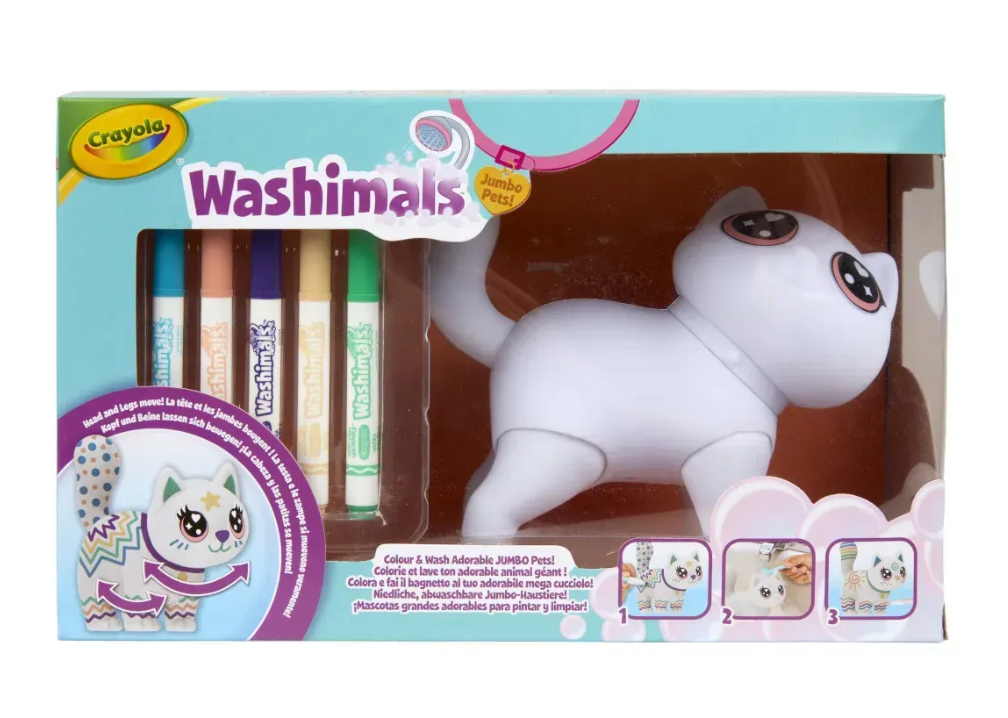 Разрисуйте, смойте и снова разрисуйте котика-великана от Crayola Washimals! У котика подвижные голова и лапки.