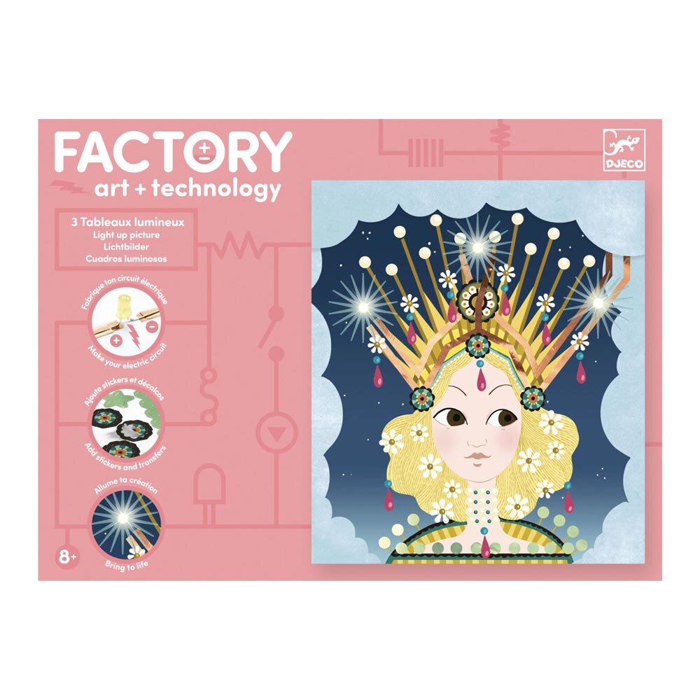 В наборе: 2 основы для изготовления картин; наклейки; 5 метров клейкого проводника; батарейка, инструкция по созданию технологических картин. Ребёнок будет развивать мелкую моторику, пространственное мышление, воображение и творить свои картины, конструировать электрические схемы с набором от бренда DJECO.