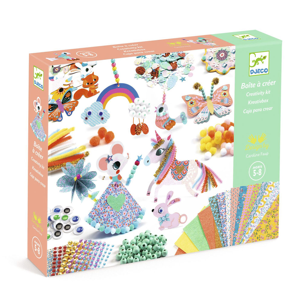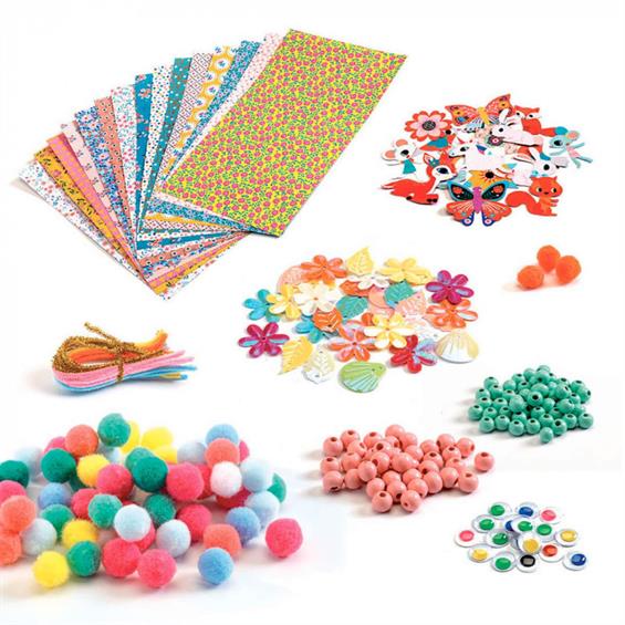 Развлечение поможет малышке стать самостоятельной: она сама создает творческий проект! В комплект входят карточки с идеями, материалы (глазки, помпоны, бусинки, наклейки) и шкатулка для хранения. Набор Djeco может быть сложным для детей 4-3 лет.