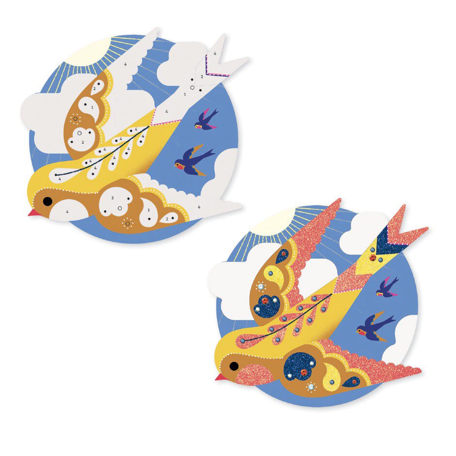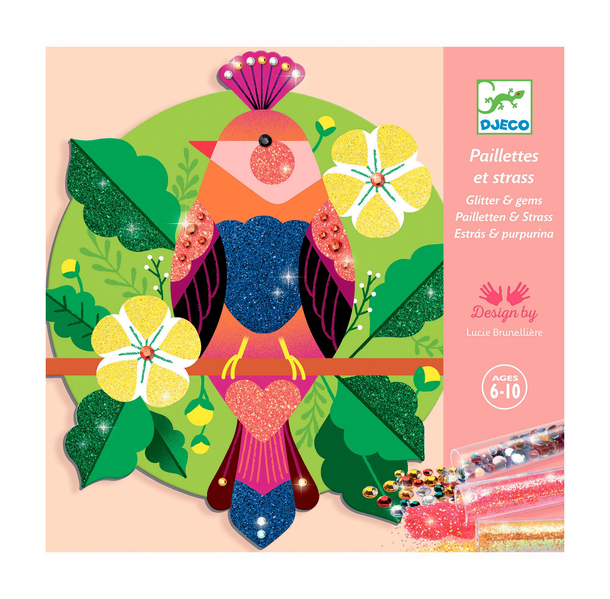Набор для творчества DJECO Райские птички состоит из 4 фигурных рисунков в виде медальонов, которые будут украшены блестками и мелкими стразами.