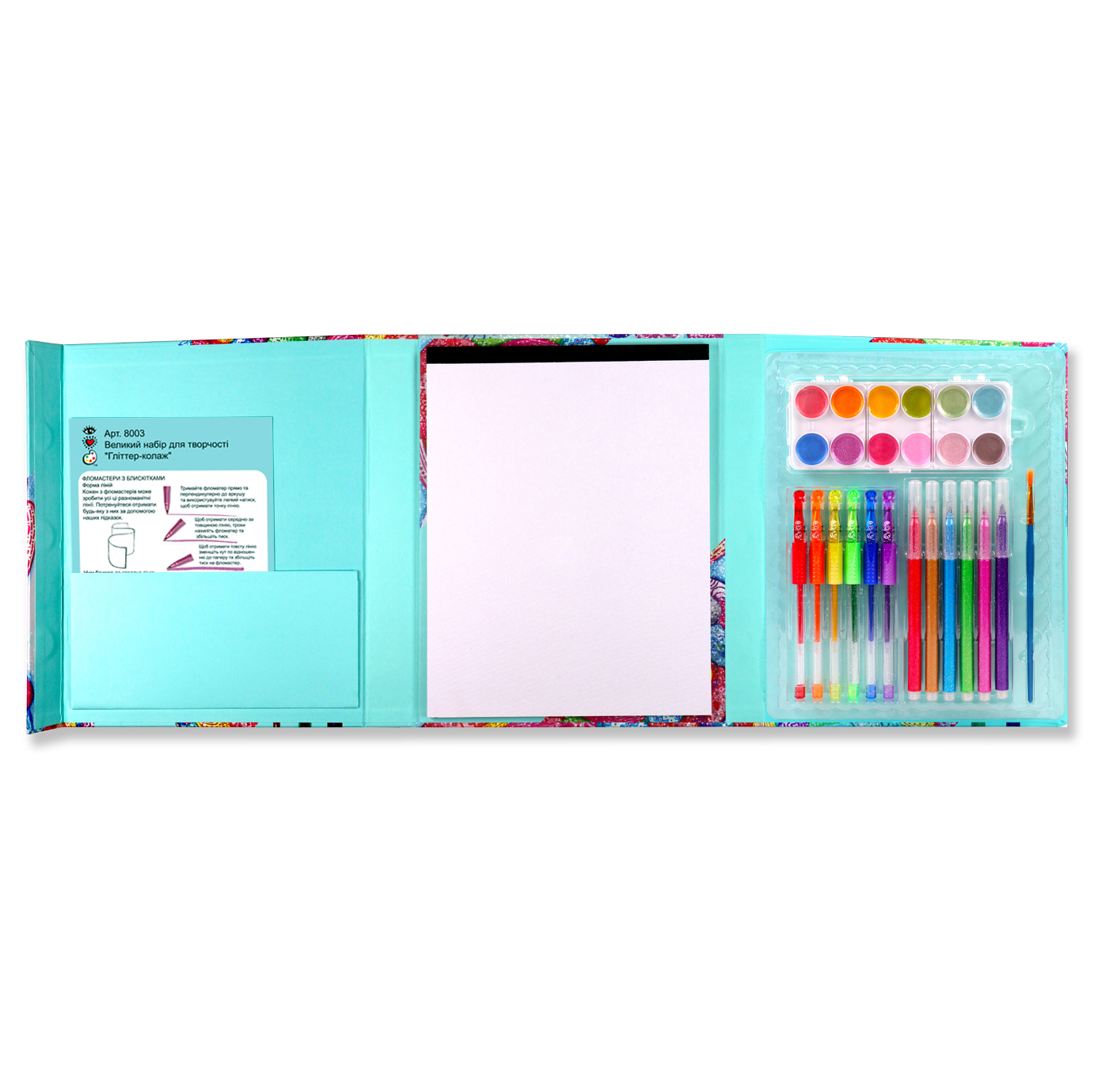 Набор в твердом переплете содержит: гид по техникам рисования на украинском языке; 12 перламутровых акварельных красок; 6 гелевых перламутровых ручек; 6 фломастеров с блестками; кисточка; 20 листов специальной бумаги.