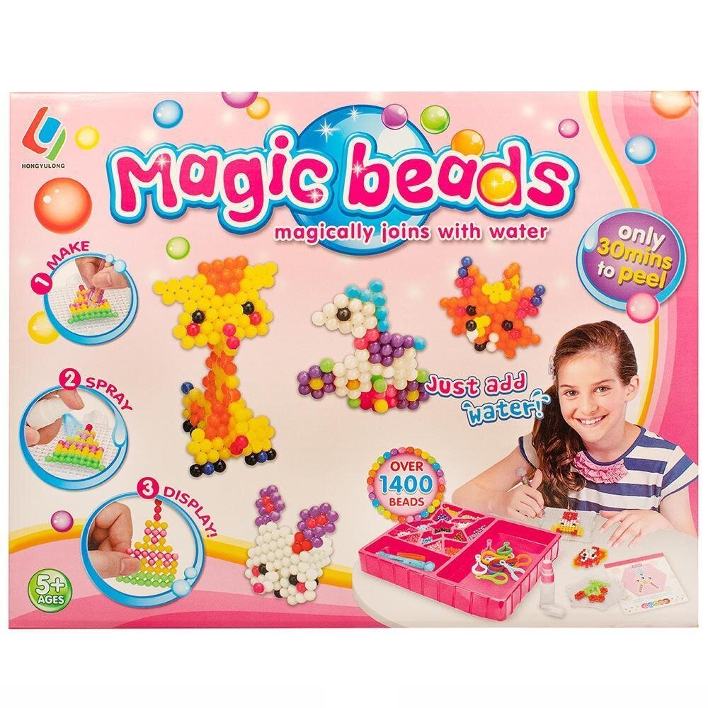 В набор входят специальные бусинки, которые скрепляются между собой с помощью воды. Достаточно продумать рисунок, который хочется получить в итоге, составить его из бусинок на трафарете, попрыскать водой из пульверизатора и оставить для фиксации на 30 минут или более. После того либо дополнить получившуюся плоскую фигурку бусинками для придания объема, либо добавить к изделию петельки, чтобы получился полноценный брелок!