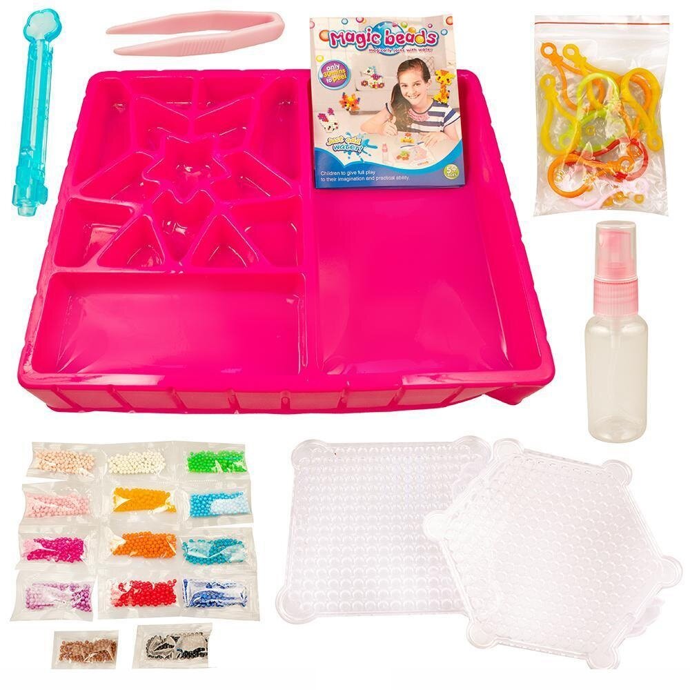 В наборе: 14 пакетиков с разноцветными бусинками, трафареты, пульверизатор, ручка для размещения бусинок, петельки, пинцет, лоток для хранения, инструкция.