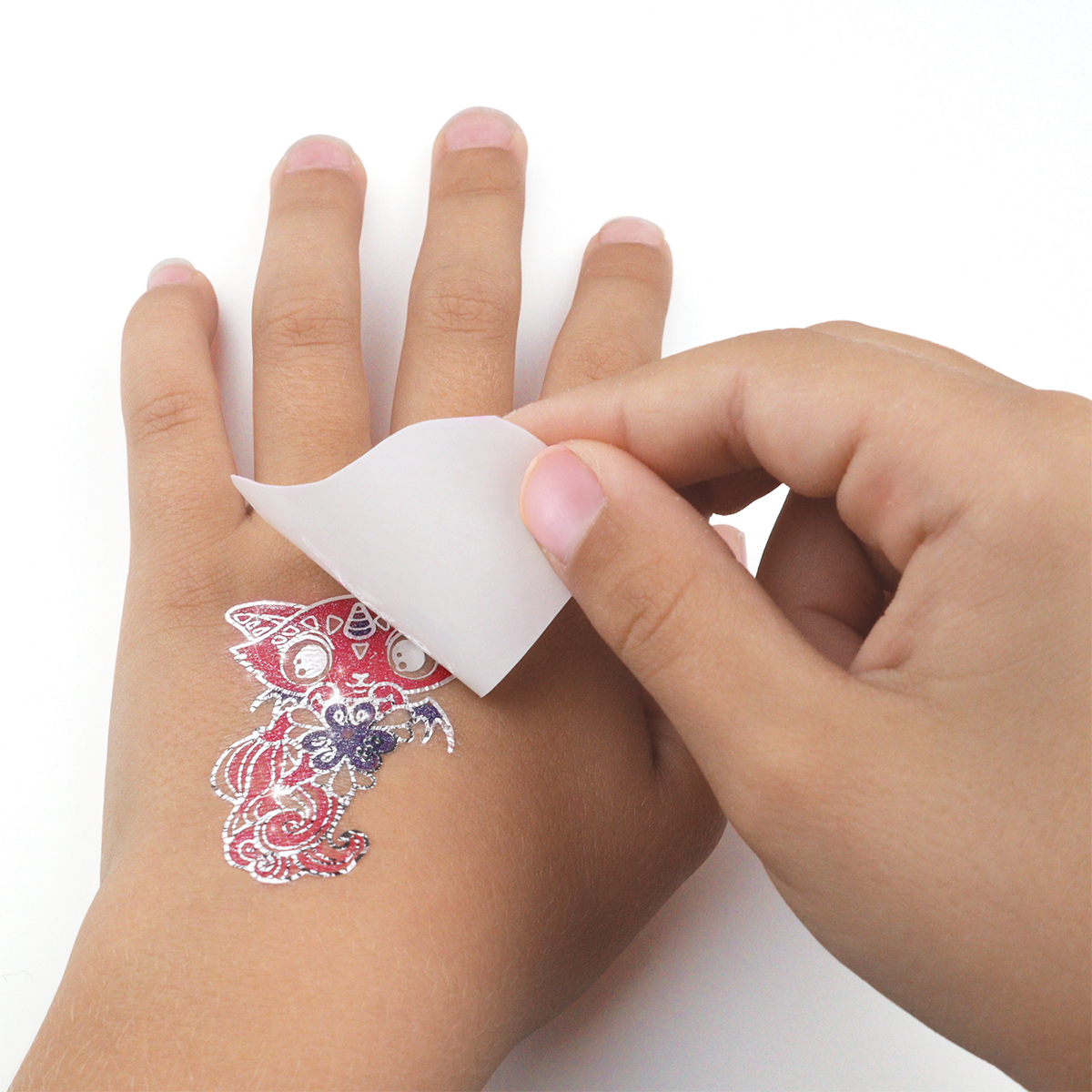 Для нанесения временной татуировки нужно: 1. выбрать тату, вырезать его и снять защитную пленку 2. раскрасить его тату ручками 3. приложить тату к коже цветной стороной вниз. На верхнюю часть тату приложите влажную ткань, чтобы бумага стала мокрой. 4. Подождите, пока тату высохнет и украсьте его с помощью кисточки с шиммером и стразами. Теперь вы сияете, словно звездочка!