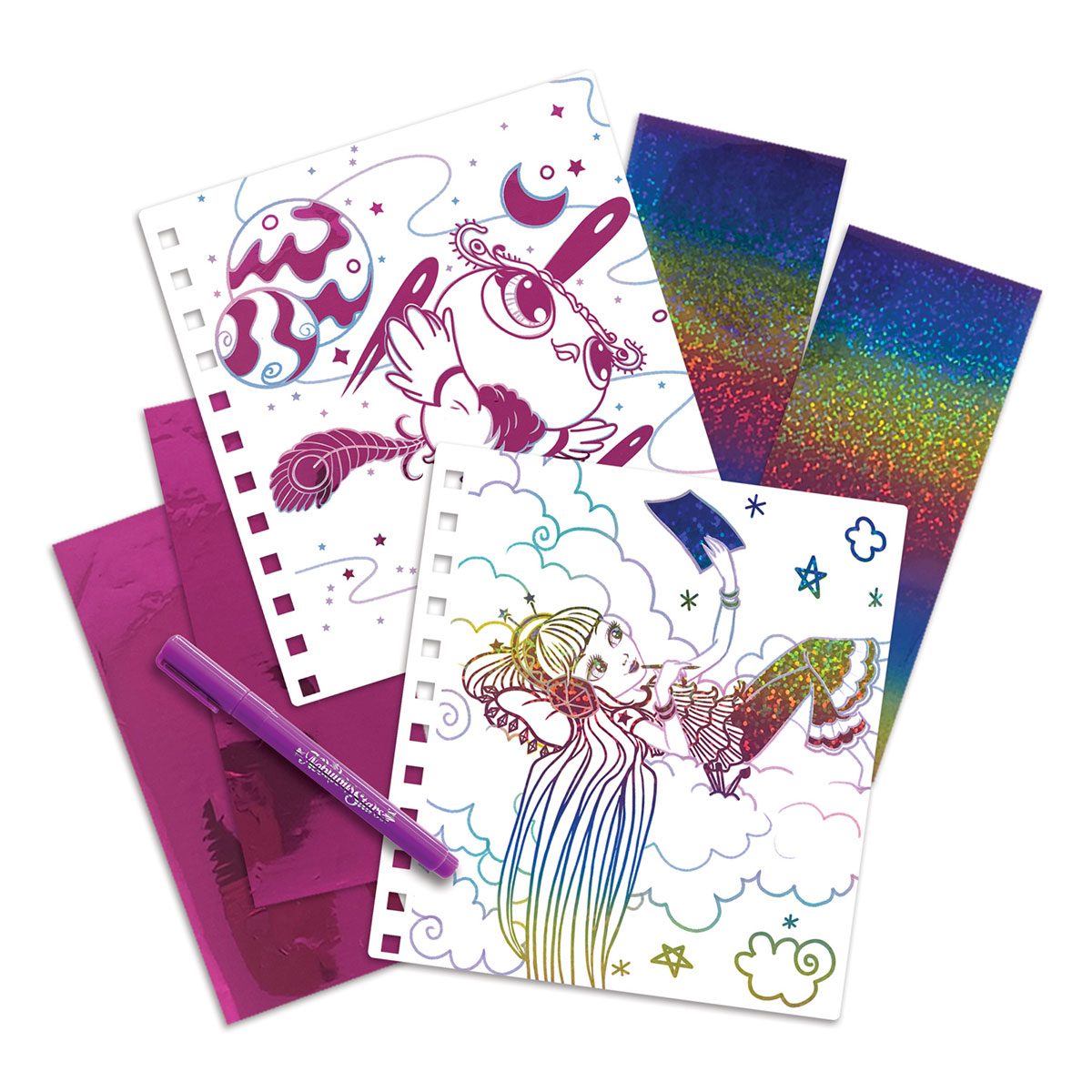 Добавьте последние штрихи к готовой картине или создайте новые произведения звездного искусства с помощью особой ручки! Она оставляет липкий след на бумаге, к которой прилипает фольга.