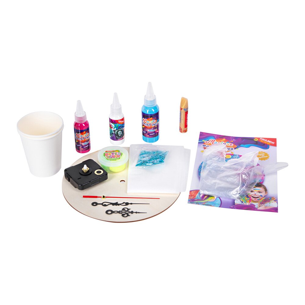 В комплекте: акриловые краски (1 × 50 мл и 2 × 30 мл), масса для лепки (1 × 8 г Super Dough и 1 × 6 мл Creamy Dough), деревянная основа, 3 стрелки, заводной механизм, два бумажных стаканчики, водонепроницаемые коврик и перчатки.