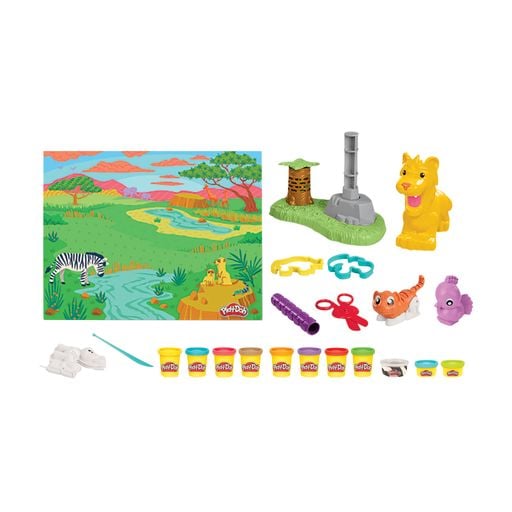Play-Doh Growin' Mane Lion and Friends — набор для настоящих маленьких фантазеров! Создай пышную гриву для льва из теста Play-Doh, а затем подстригай, украшай и экспериментируй с прически. В комплекте — 5 дополнительных инструментов с животными: форма для зебры с эффектом полосатого теста, тигровый молд для малышей-тигрят, два резных ножа в форме животных и штамп-павлин для создания роскошных перьев.