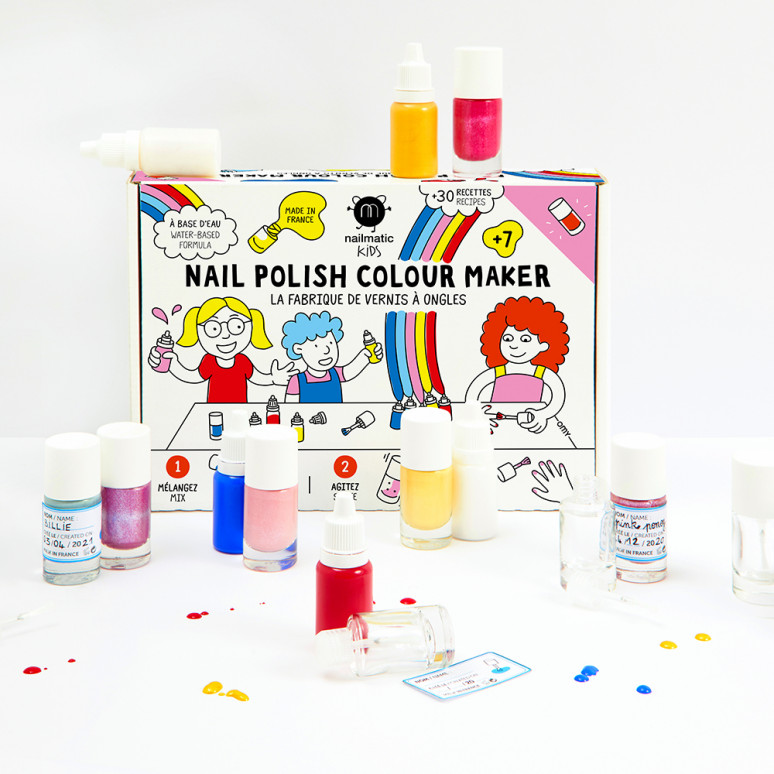 Набор для изготовления детского лака для ногтей Nailmatic содержит все необходимое для изготовления 4 лаков для ногтей на водной основе для детей: