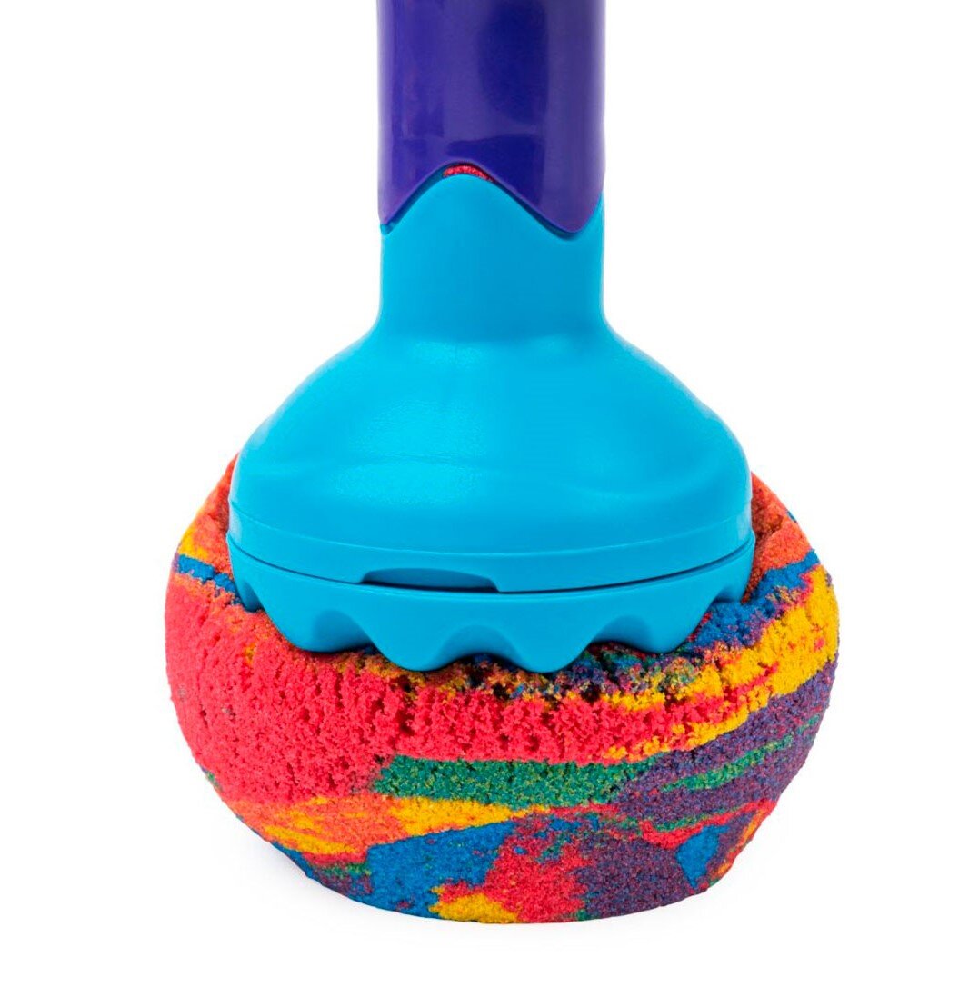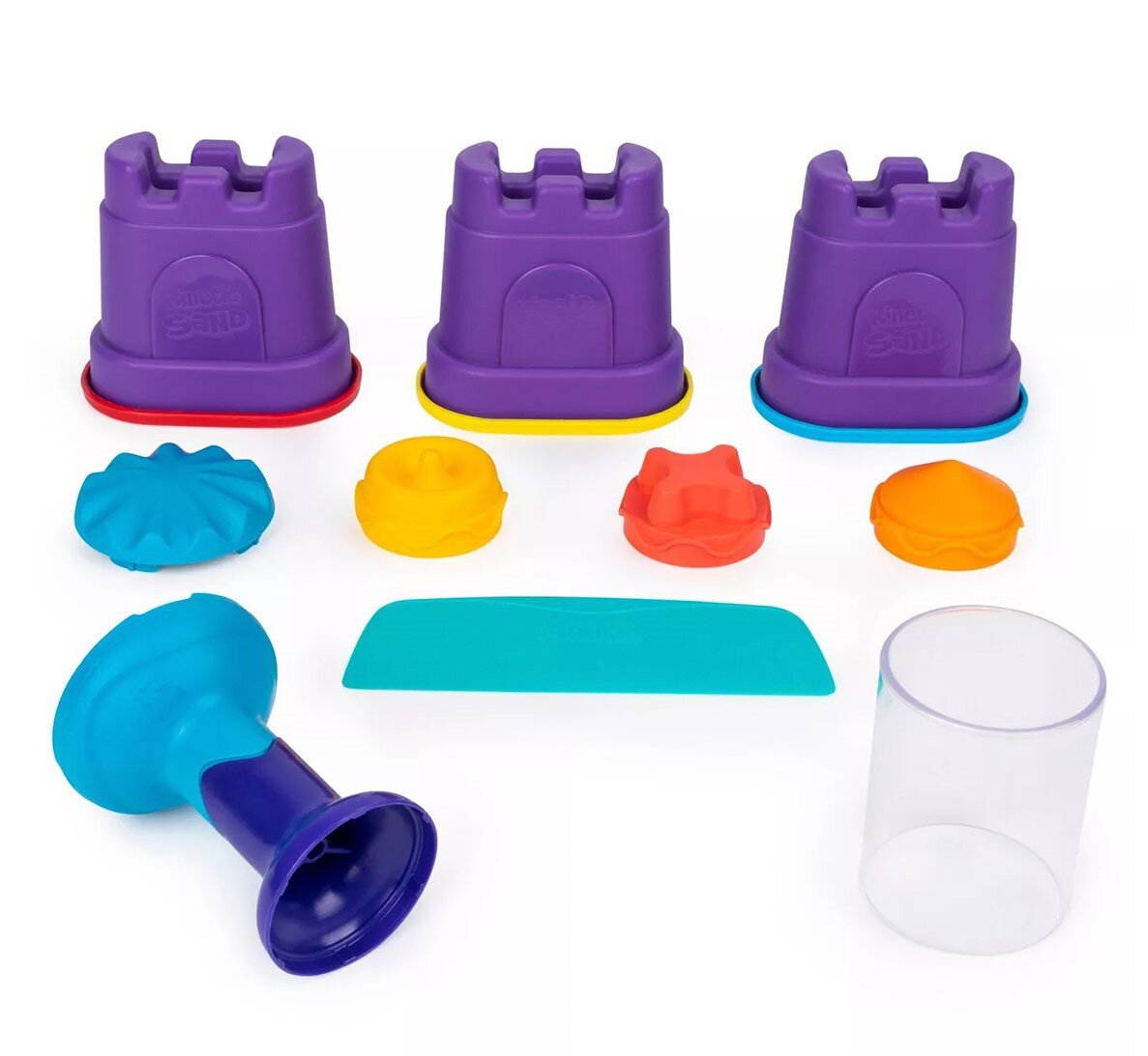 В набор входит: кинетический песок трех цветов (по 128 г красного, желтого и синего цветного песка); 3 формочки-замки; прозрачная цилиндрическая форма; пресс; 4 фигурных штампа; пластиковый нож-слайсер.