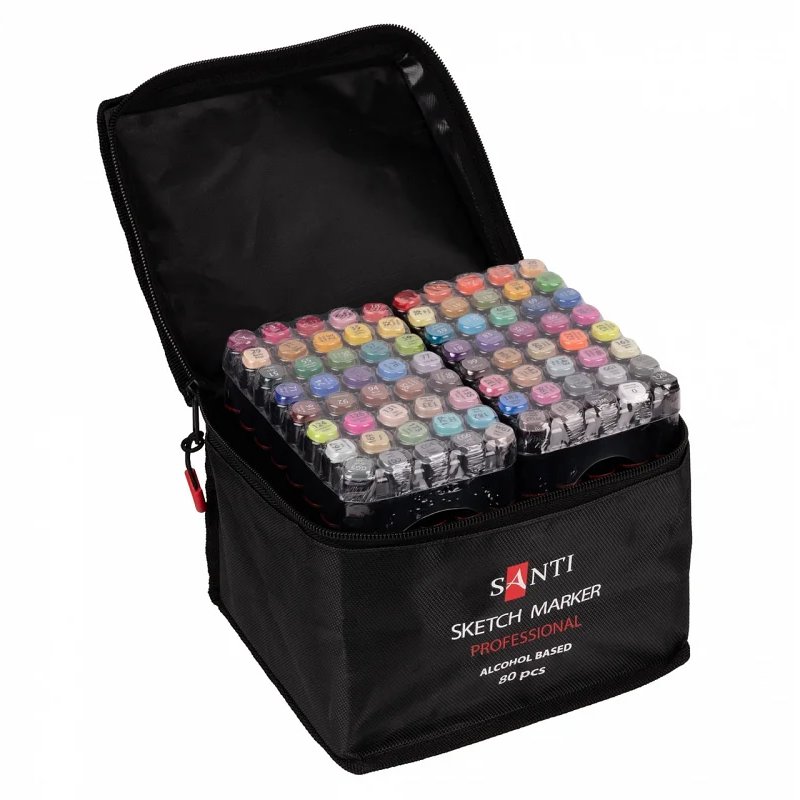 В наборе 80 маркеров разного цвета, для удобства название цвета нанесено на колпачок.