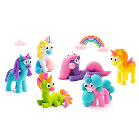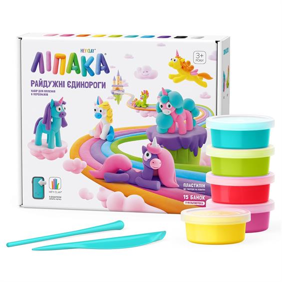 Меганабор самостоятельно твердеющего пластилина ЛИПАКА – РАДУЖНЫЕ ЕДИНОРОГИ – развлечет и малышей, и взрослых. С помощью анимационных инструкций в приложении HEY CLAY, вы сможете слепить 6 удивительных единорожков: Лайти, Санни, Рейни, Брайти, Спарки и Клауди. Пластилин твердеет на воздухе в течение 24 часов, после чего можно играть созданными фигурками.