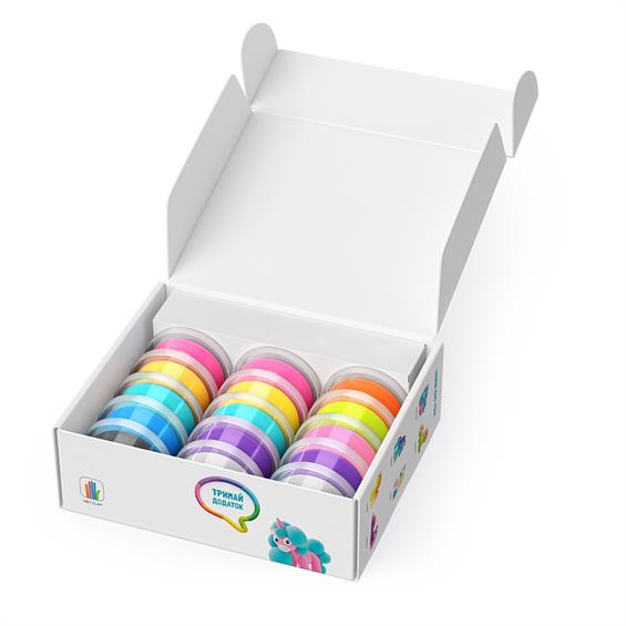 В набор может входить до 14 разных цветов (баночка может содержать пластилин двух разных цветов).