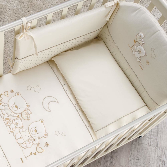 Happy Family Ivory (100.0054-6) – набор постельного белья для детской кроватки ItalBaby. Включает в себя пять предметов. Изготовлен из 100% хлопка. Наполнитель одеяла – синтепон.