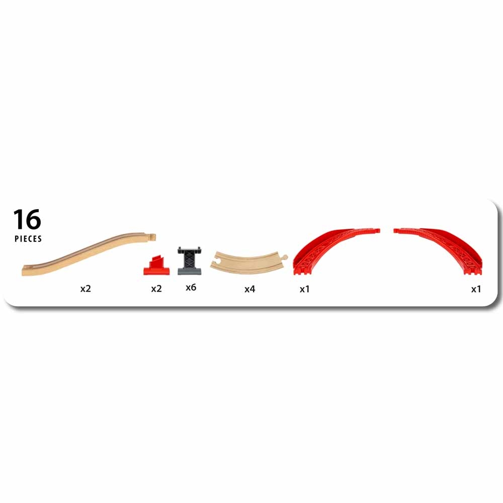 Дополните свои наборы поездов BRIO World используя Набор восходящих кривых рельсов для железной дороги BRIO (33995). Эти извилистые рельсы добавят скорость, высоту и яркие краски на ваши железнодорожные пути.