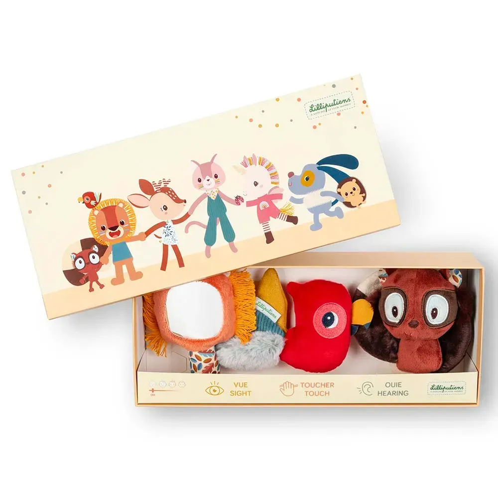 Представленные в красивой иллюстрированной коробке, эти игрушки для сенсорной стимуляции стимулируют 3 органа чувств: зрение, осязание и слух. Вы найдете лемура Элвиса, который забавно шуршит, льва Джека с его красивой гривой и маленьким зеркальцем, в которое можно за собой наблюдать, а также яркого попугая Жиля, который имеет несколько текстур, которые можно исследовать кончиками пальцев. Это милое и красочное трио также украшено оригинальными узорами. Они - первые спутники малыша!