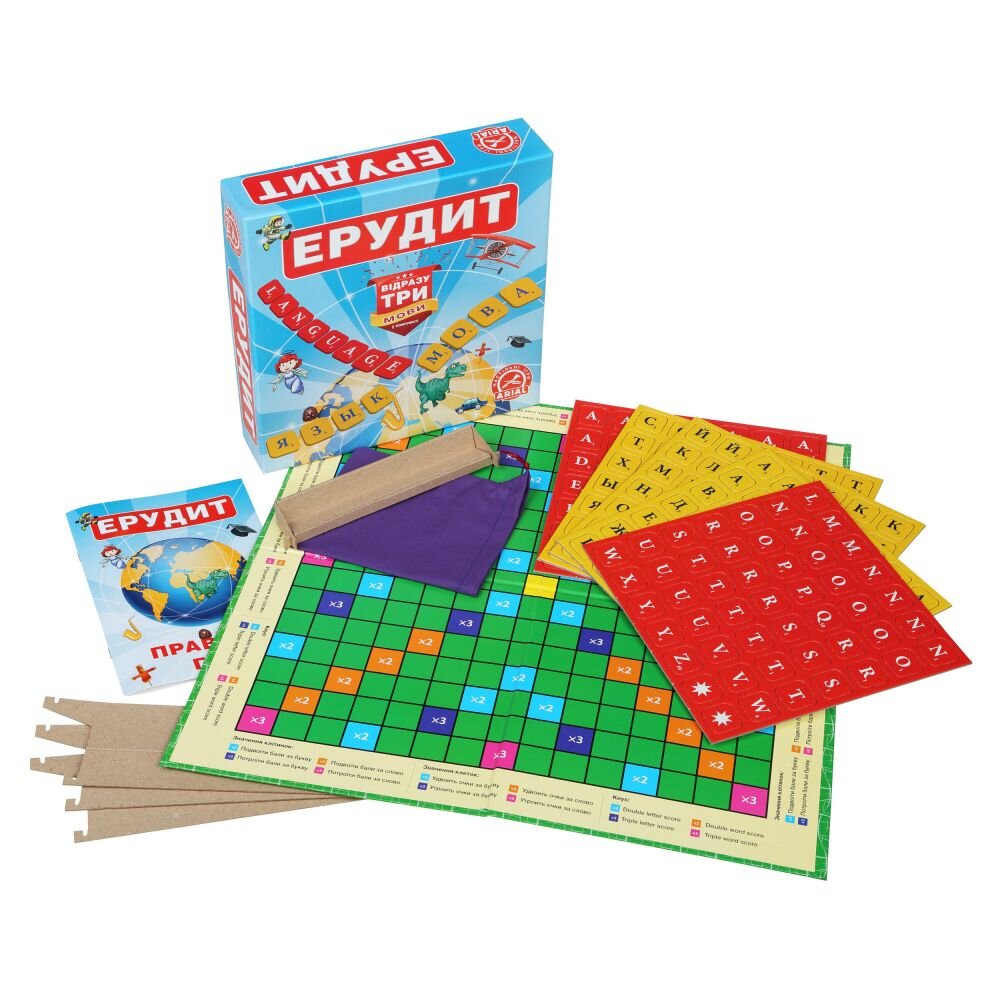 Комплектация: игровое поле, комплект фишек с буквами на украинском, русском и английском языках, мешочек для фишек, 4 подставки для фишек, правила игры.