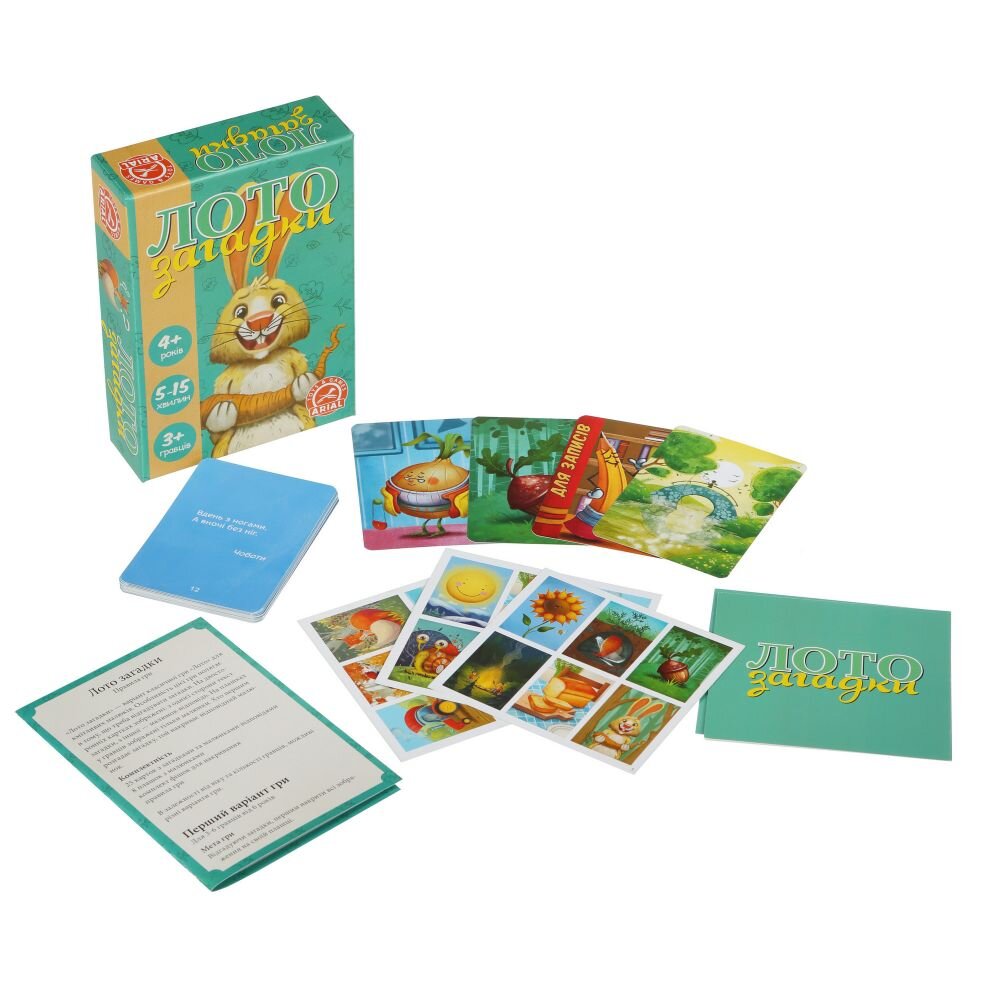 Вариант классической игры «Лото» для сообразительных детей. Особенностью этой игры является то, что надо не находить цифры, или изображения, а отгадывать загадки. В комплекте игре 25 двусторонних карточек - с одной стороны текст загадки, с другой рисунок-ответ. На плашках у игроков находятся только высокохудожественные авторские рисунки. Накрывает соответствующий рисунок тот, кто первым разгадал загадку.Для детей от 4-х лет.