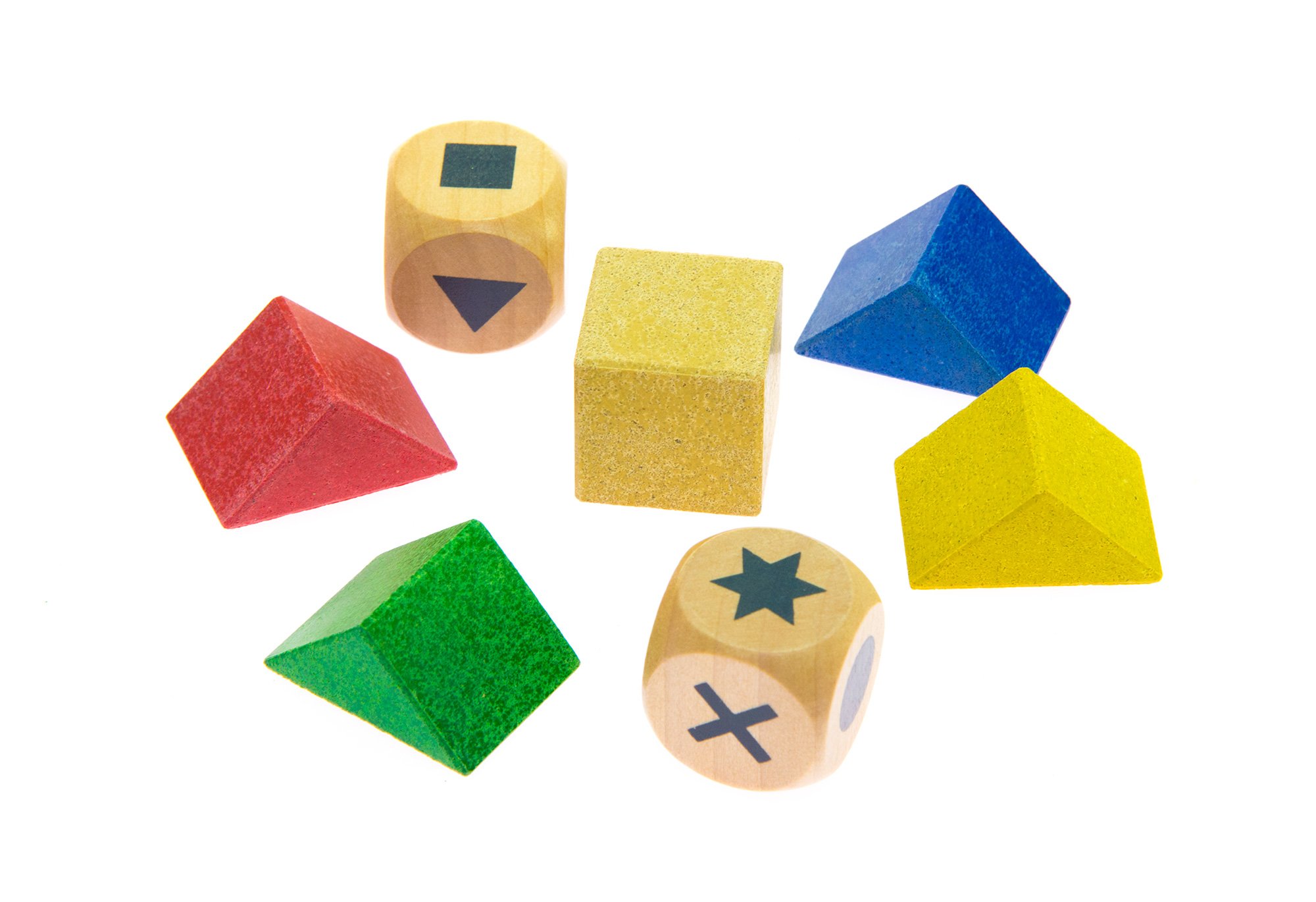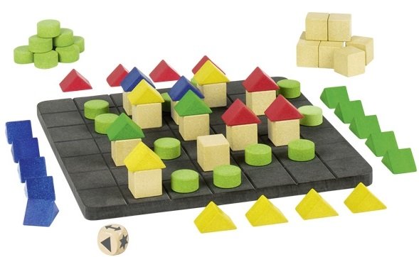 В состав набора входят: 22 кубика натурального цвета, 21 диск светло-зеленого цвета, по 7 треугольников красного, желтого, синего и зеленого цветов, 1 игральный кубик, плоскость для строительства и инструкция.