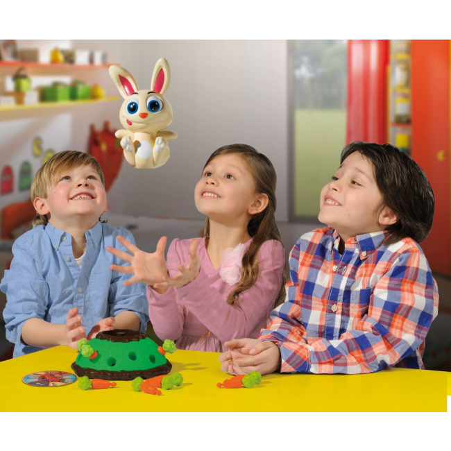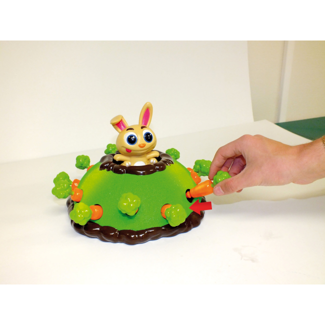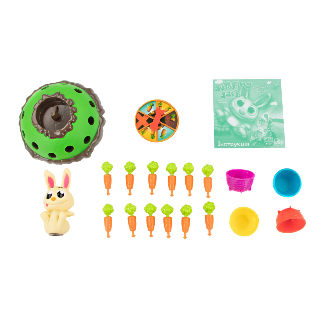 Комплектование: 1 кроличья норка, 1 фигурка кролика Джека-прыгуна, 12 морковок, 1 рулетка.