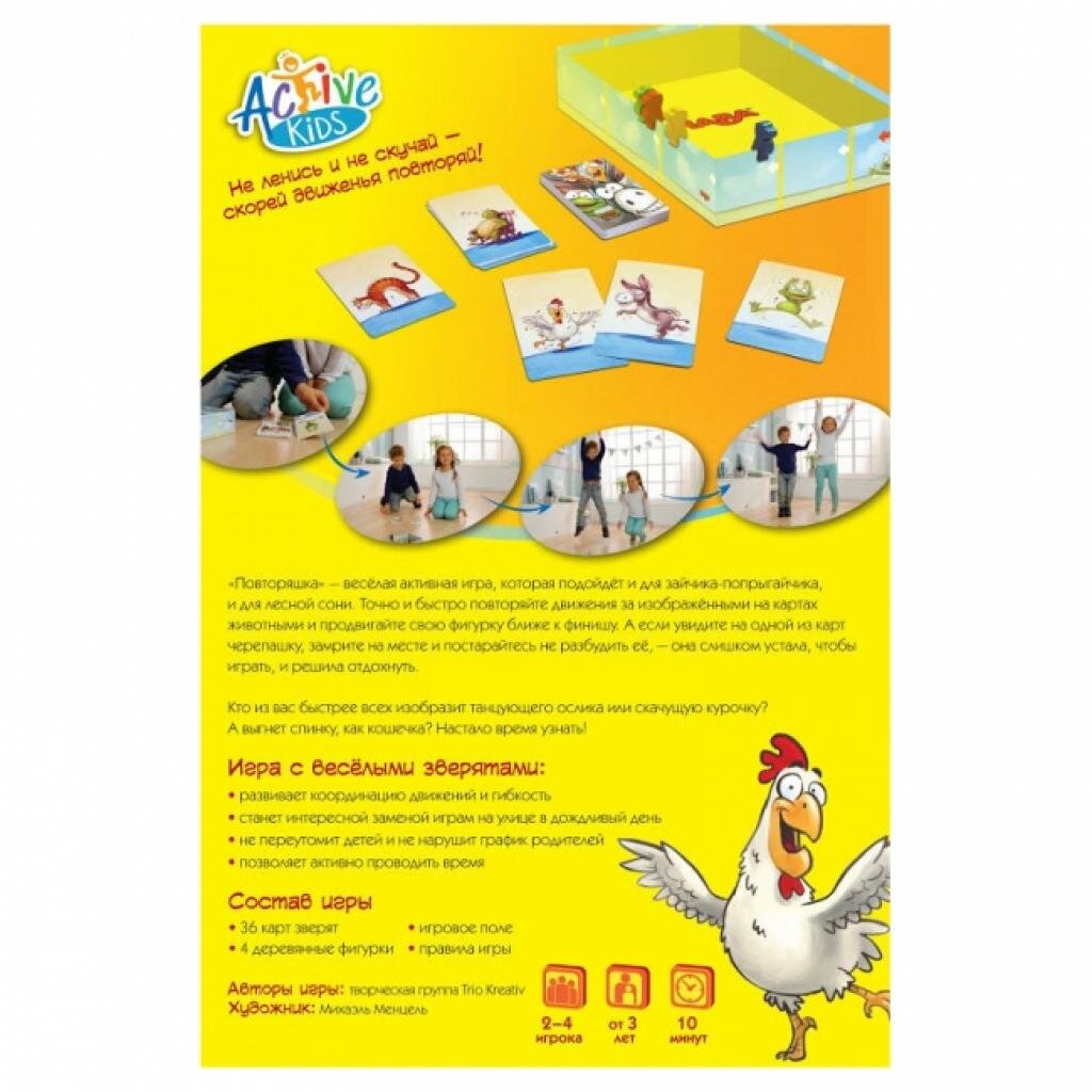"Повторяшка" – весёлая активная игра, которая подойдёт и для зайчика-попрыгайчика, и для лесной сони. Точно и быстро повторяйте движения за изображёнными на картах животными и продвигайте свою фигурку ближе к финишу. А если увидите на одной из карт черепашку, замрите на месте и постарайтесь не разбудить её, – она слишком устала, чтобы играть, и решила отдохнуть.