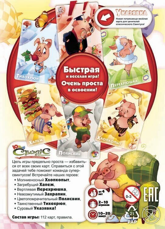 Настольная игра «Свинтус» - быстрая и весёлая карточная игра для 2-10 человек практически любого возраста. Игра стала очень популярна за счёт простоты своих правил, динамичности и настоящего кутежа во время партий.