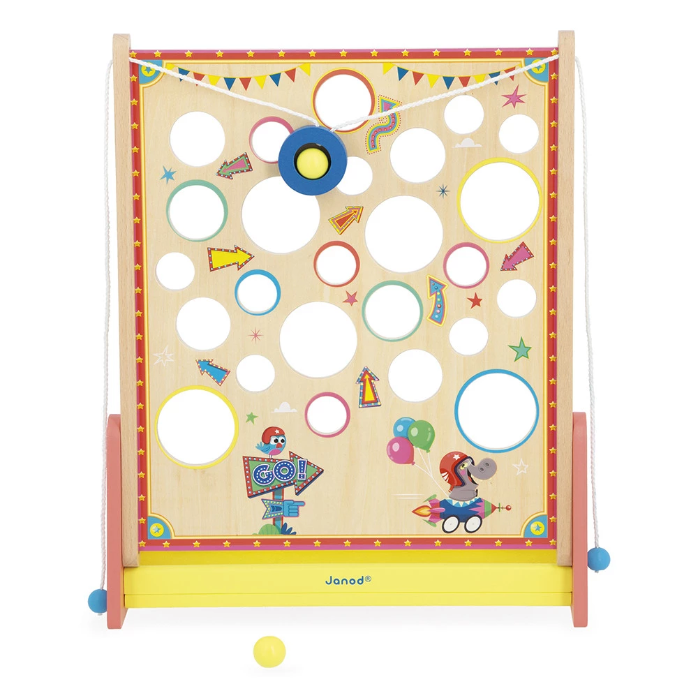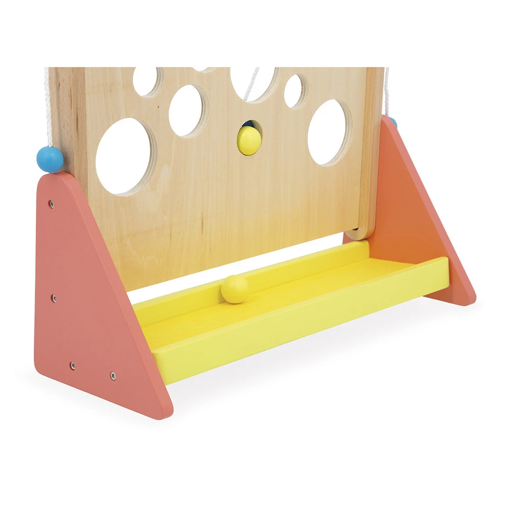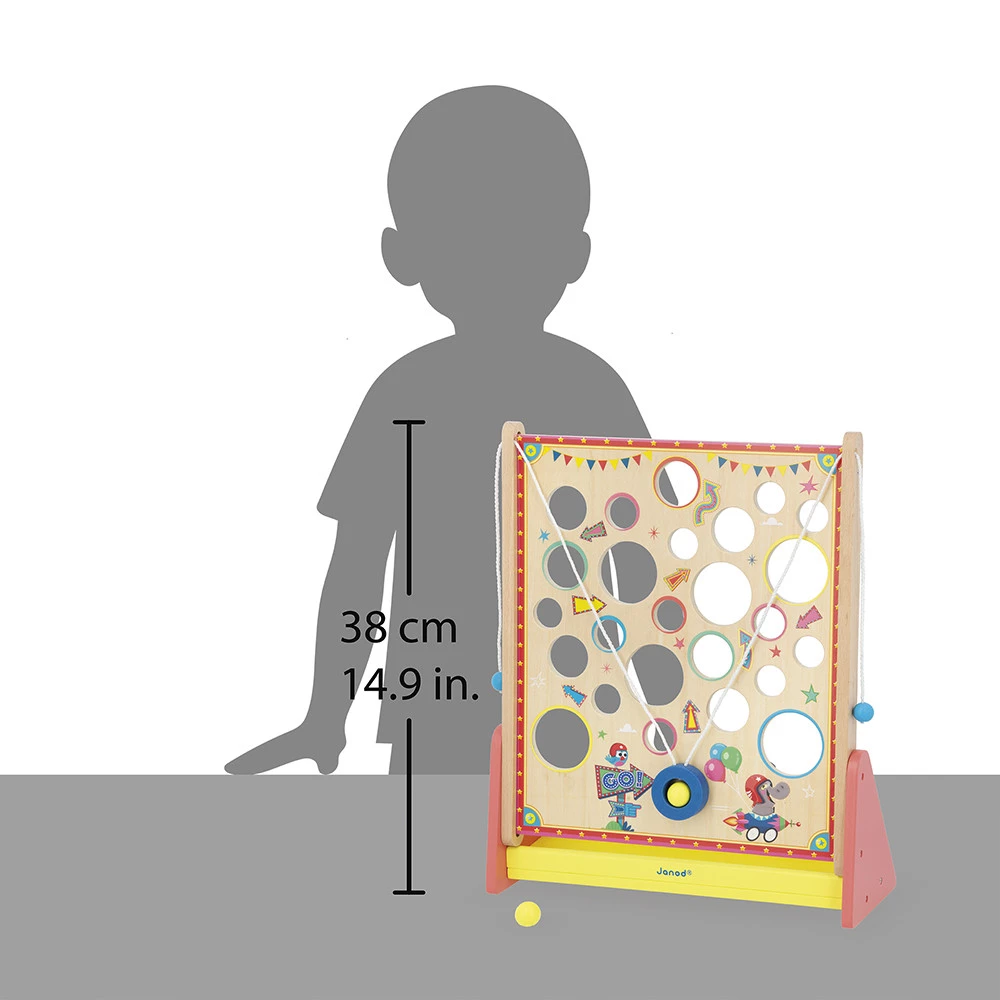 Деревянная игра на ловкость от 5 лет: управляйте двумя веревками и проведите шарик вверх по лабиринту, избегая отверстий. Развивает координацию, внимание и терпение, подходит для семейных соревнований. В комплекте 2 деревянных шарика и подставка с фетровым покрытием для тихого падения. Изготовлено из дерева с сертификацией FSC™.