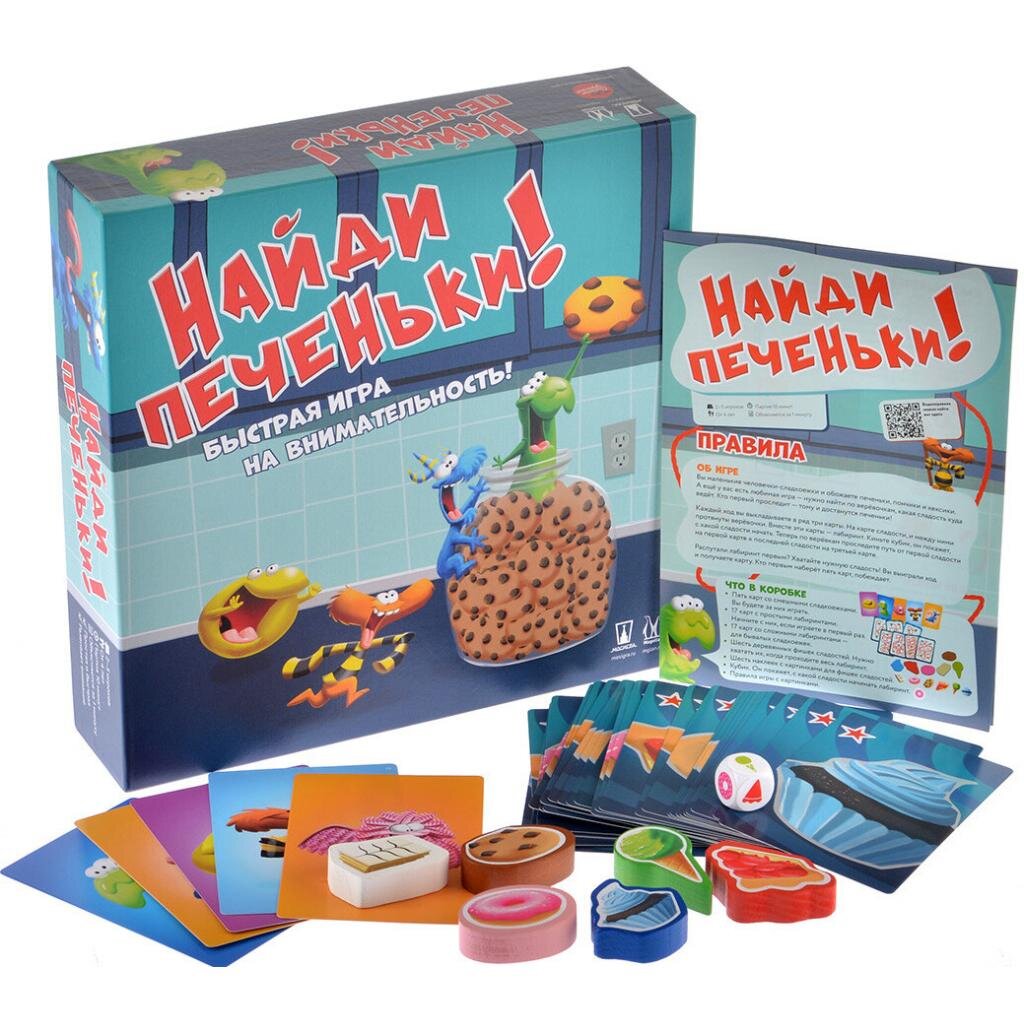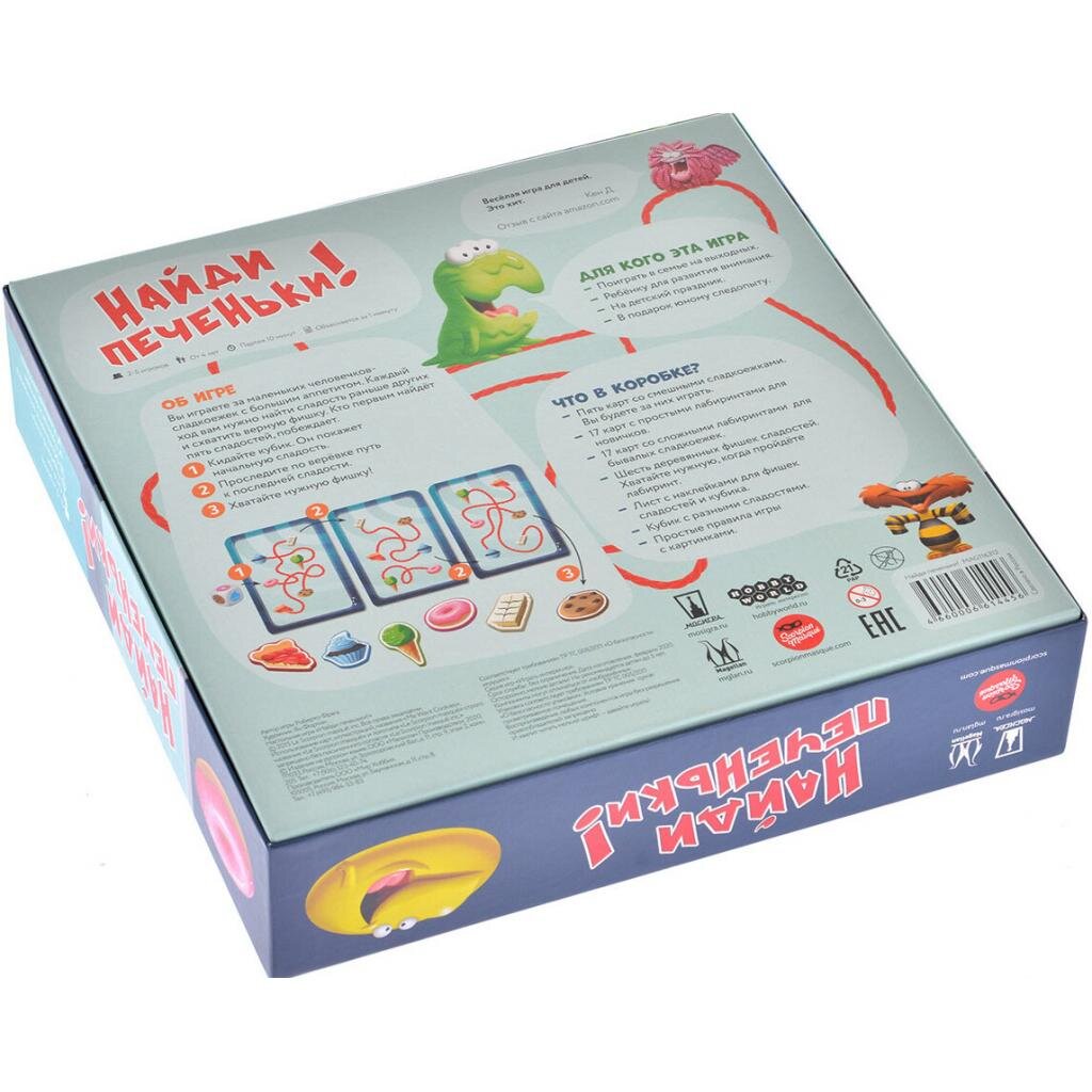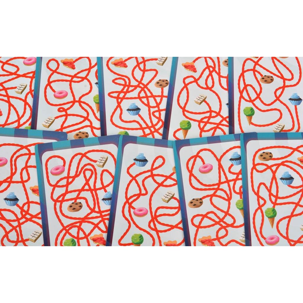 Комплектация: 5 карт со смешными человечками, 17 карт с простыми лабиринтами для новичков, 17 карт со сложными лабиринтами для бывалых сладкоежек, 6 деревянных фишек сладостей, 6 наклеек с картинками, Кубик с разными сладостями, Правила игры.