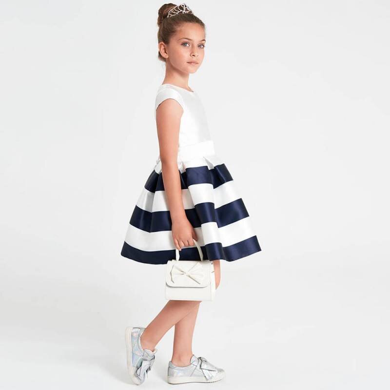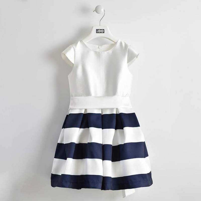 Ваша девочка станет принцессой стиля в этом платье iDO. Платье выполнено из фактурного атласа, дает легкий эффект глянца. Лиф кремового цвета, а юбка в широкую темно-синюю горизонтальную полоску со встречными складками. Мягкая подкладка из 100% хлопка обеспечивает полный комфорт, а тюль под юбкой добавляет платью больше объема. Дополнительным украшением служит широкий пояс из того же материала, что и платье, и завязывается на бант. Застежка - скрытая молния на спине.