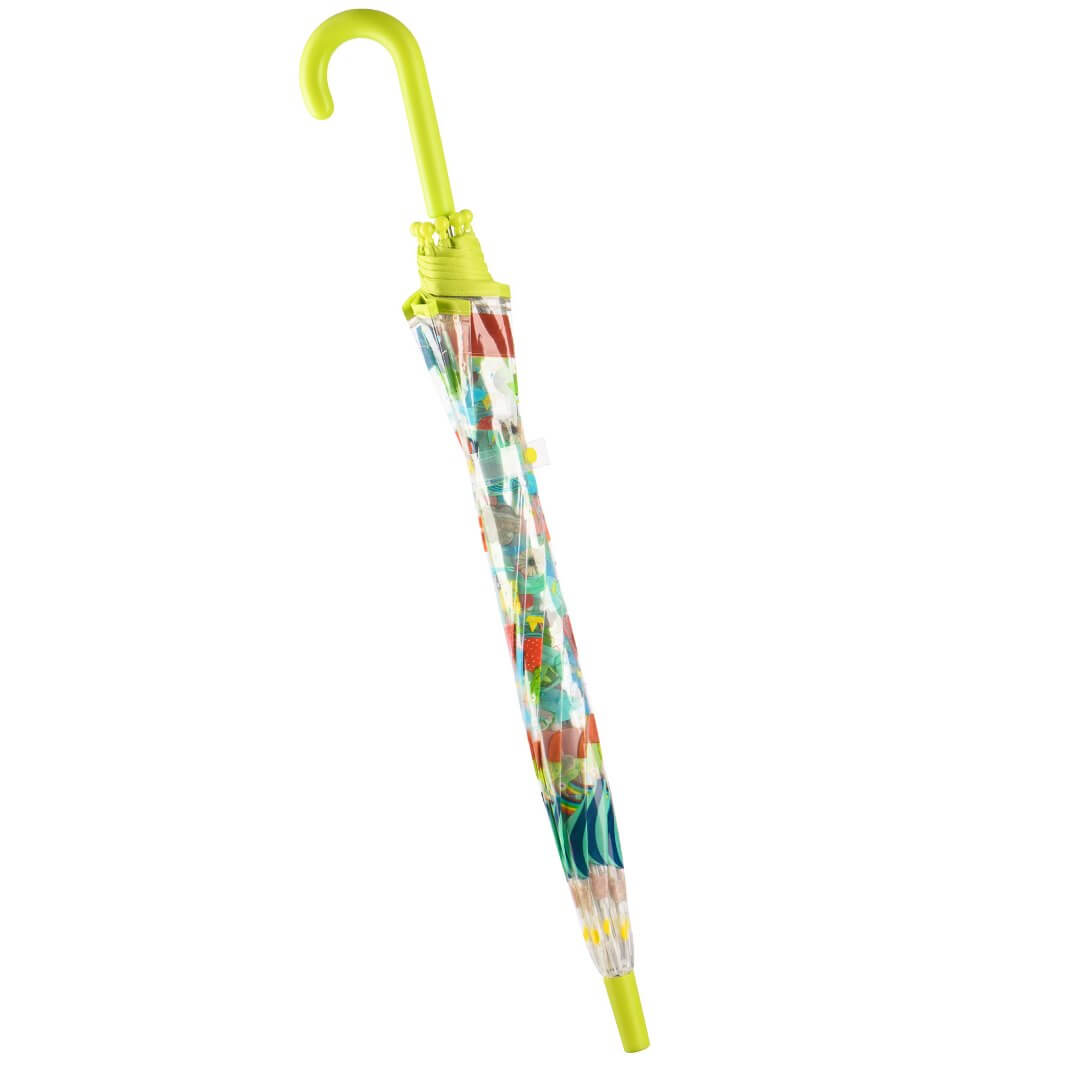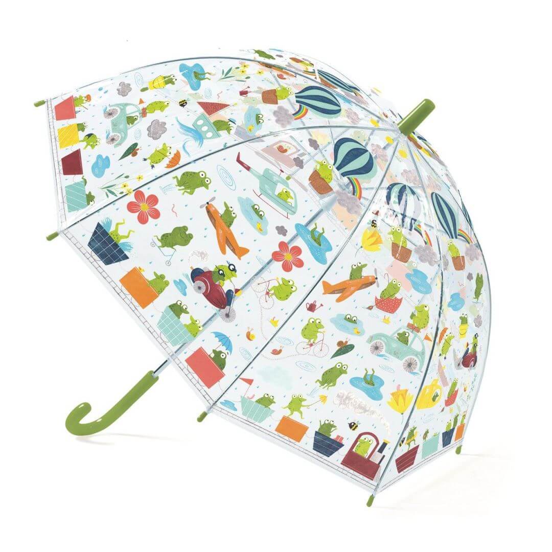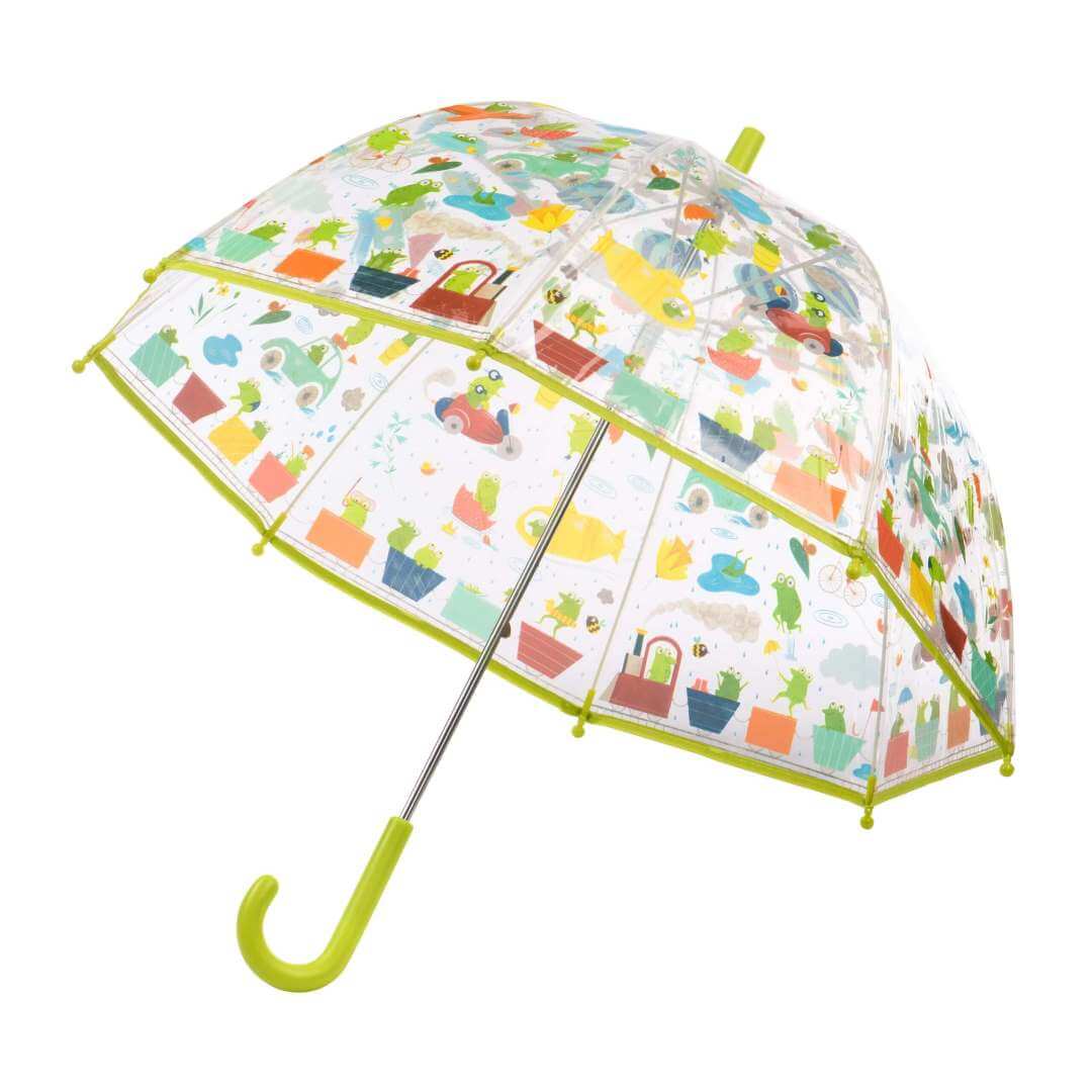 Красочный зонт-трость французского бренда Djeco не только защитит ребенка от дождя, но и поднимет настроение в пасмурный день. На прозрачном куполе изображены лягушки-путешественницы. Они купаются, пьют кофе, едут на велосипеде, летят на воздушном шаре... Из рисунков видно - жить следует ярко, и никакой дождь этому не помеха. Механическая зонтик открывается вручную. Имеет систему безопасного открывания, защищает пальцы от травм, а концы стержней сделаны как пластиковые шарики. Спицы детского аксессуара изготовлены из пластика. Материал купола - 100% полиэстер, с тефлоновым покрытием. Размер раскрытого зонтика - 70 х 68 см, в сложенном виде - 5 х 68 см. Артикул 794315.