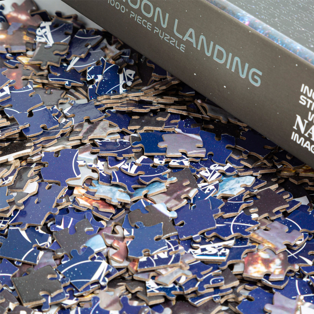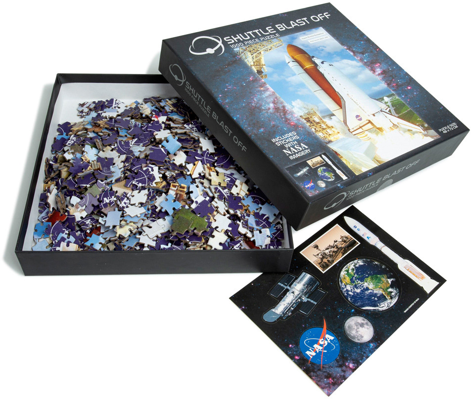 В линейке есть 2 вида пазлов - Взлет шаттла и высадка на Луну на выбор. Обе головоломки также поставляются с наклейками NASA.