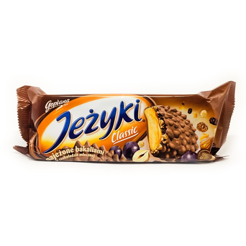 Jezyki Classic – печенье с карамелью, изюмом, лесными орехами и воздушным рисом, покрытое молочным шоколадом. Вес – 140 г. Рекомендуемый возраст – от 3-х лет.