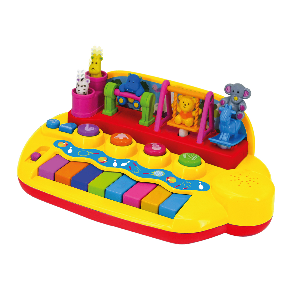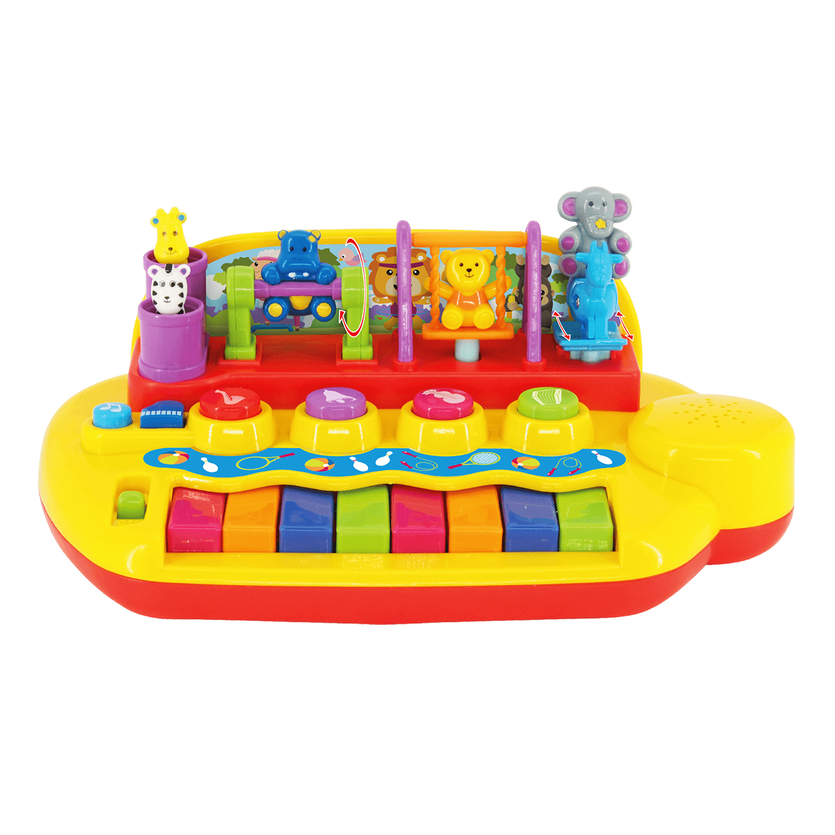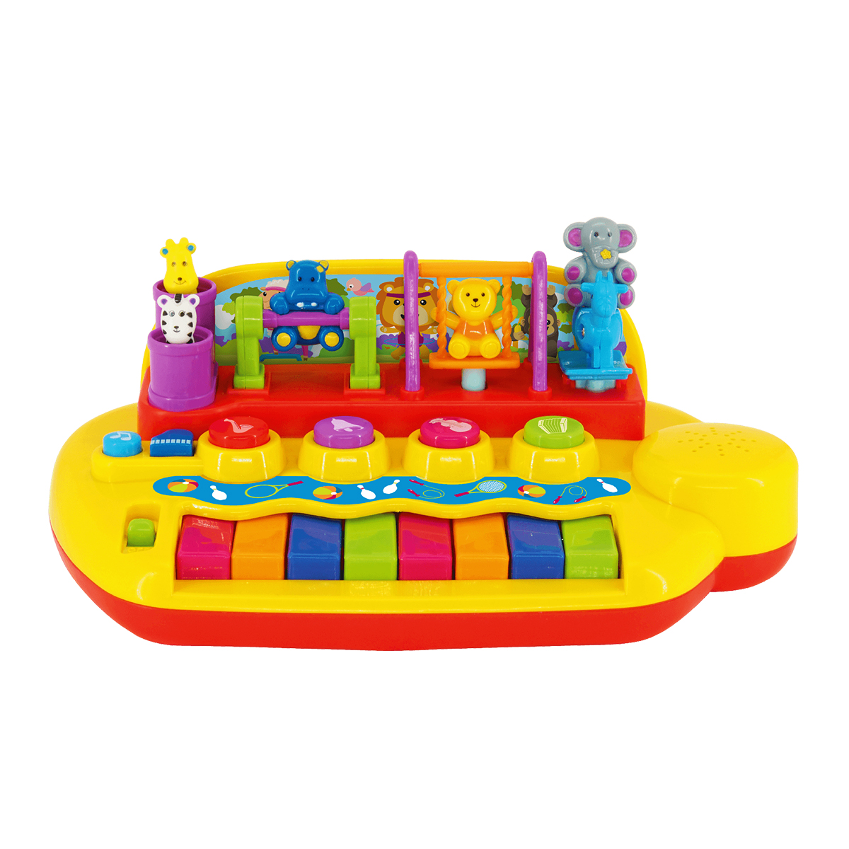На игровой панели размещены фигурки животных, которые весело двигаются, когда малыш играет на пианино или слушает песенки или мелодии.