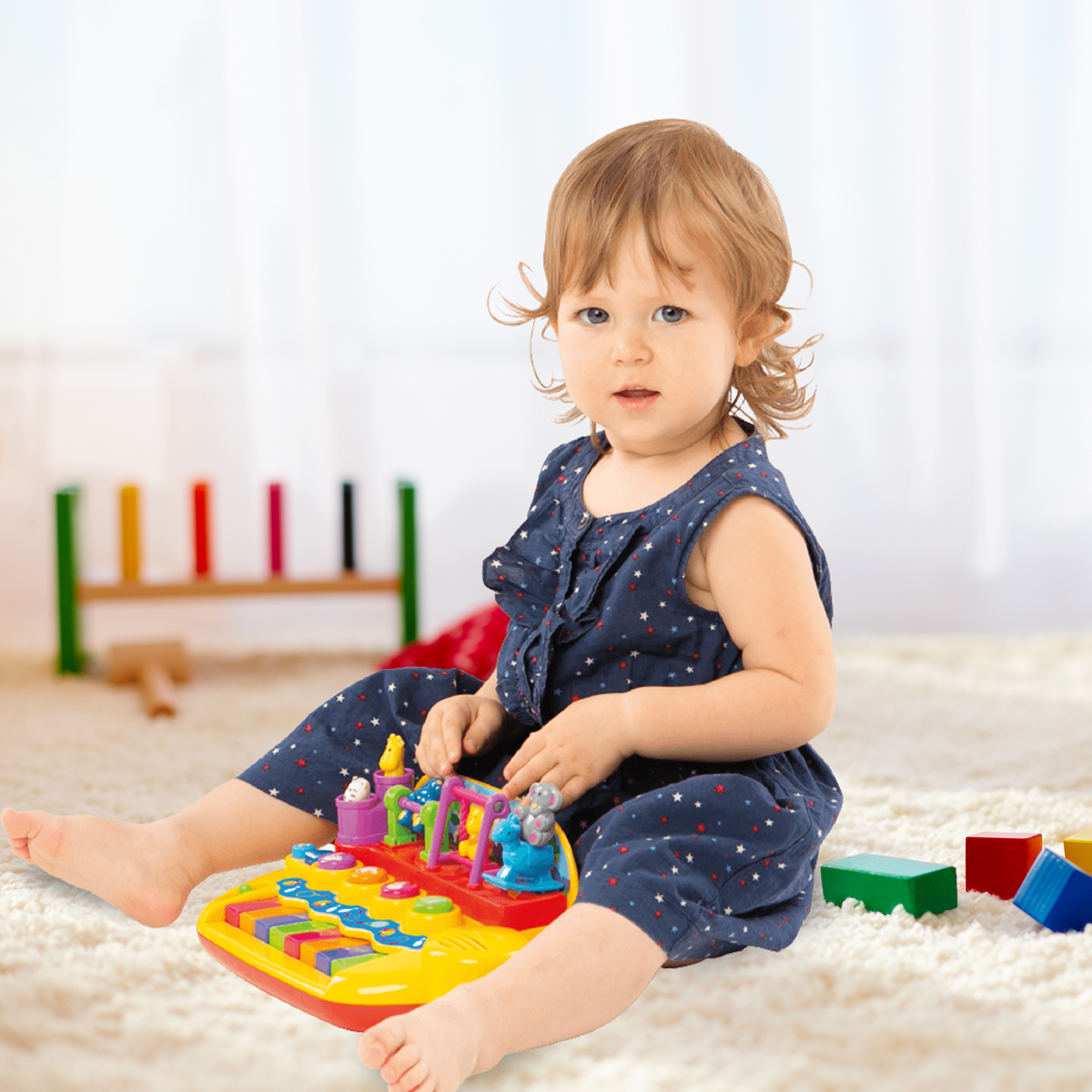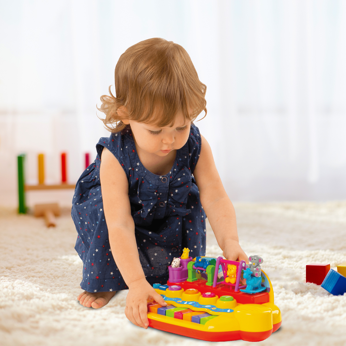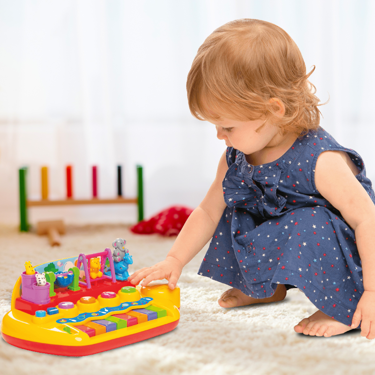 На игровой панели размещены фигурки животных, которые весело двигаются, когда малыш играет на пианино или слушает песенки или мелодии.