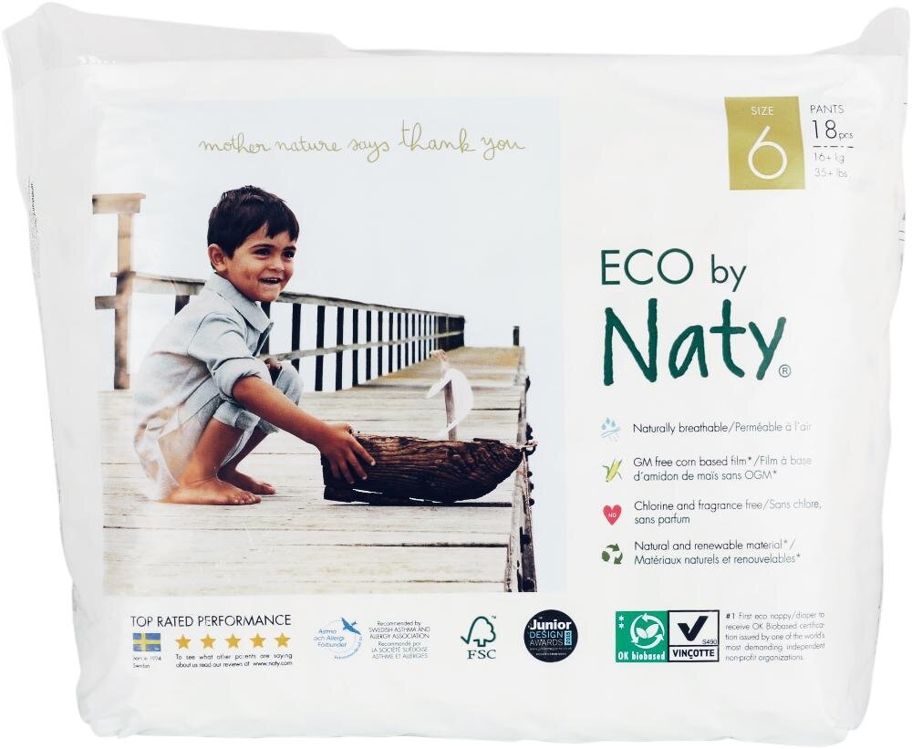 Подгузники-трусики ECO by Naty, размер 6 подходят для детей весом от 16 кг. В упаковке 18 штук.