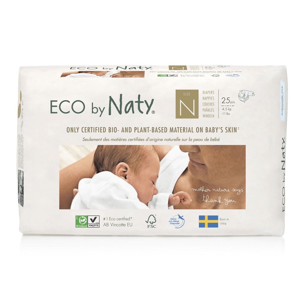 Підгузники ECO by Naty размером 0 подходят новорожденным весом до 4,5 кг. В упаковке 25 штук.