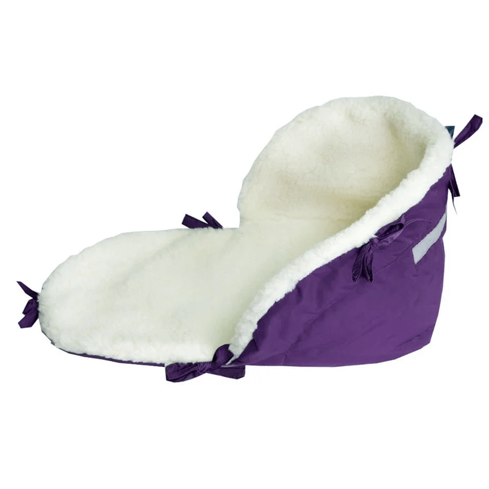 Подстилка на овчине, с которой будет тепло и мягко в санках во время зимних прогулок. Фиксируется семью завязками. Можно стирать в машинке. Цвет наружной части (плащевки) – фиолетовый.