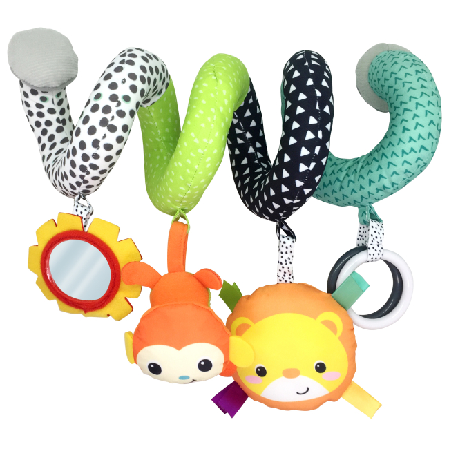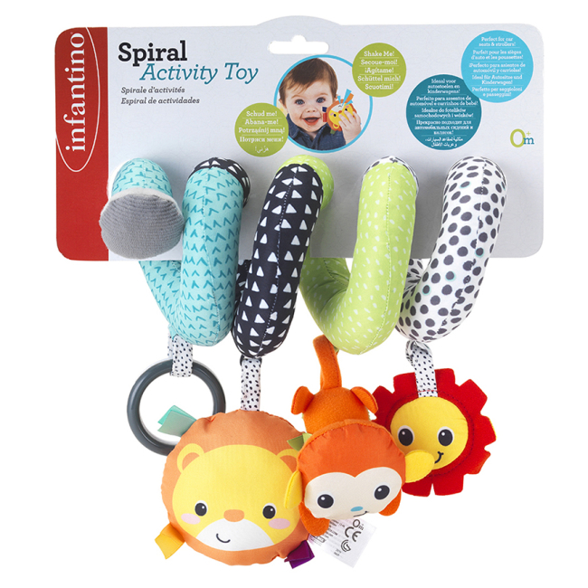 Подвеска Infantino Спираль Сафари имеет 4 уникальных лязгающих, мнущихся и качающихся игрушек.